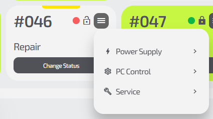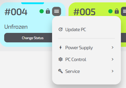 The PC card in the Computers section contains a set of elements that allow the administrator to see the current state of the PC, the user status and the available actions. The content of the card changes depending on the current state of the PC.