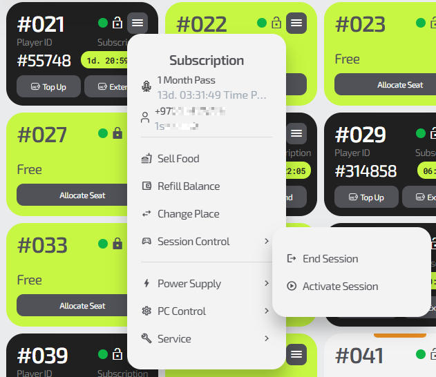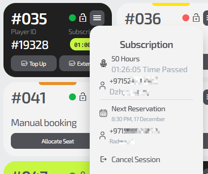 Time until the end of the current session and the start of the next one (if another session has already been booked after the current one), or the Extend button (extend the current session by selecting an extension package and paying for it). If there is a next booking after the current session, information about the next session will appear in the card menu.