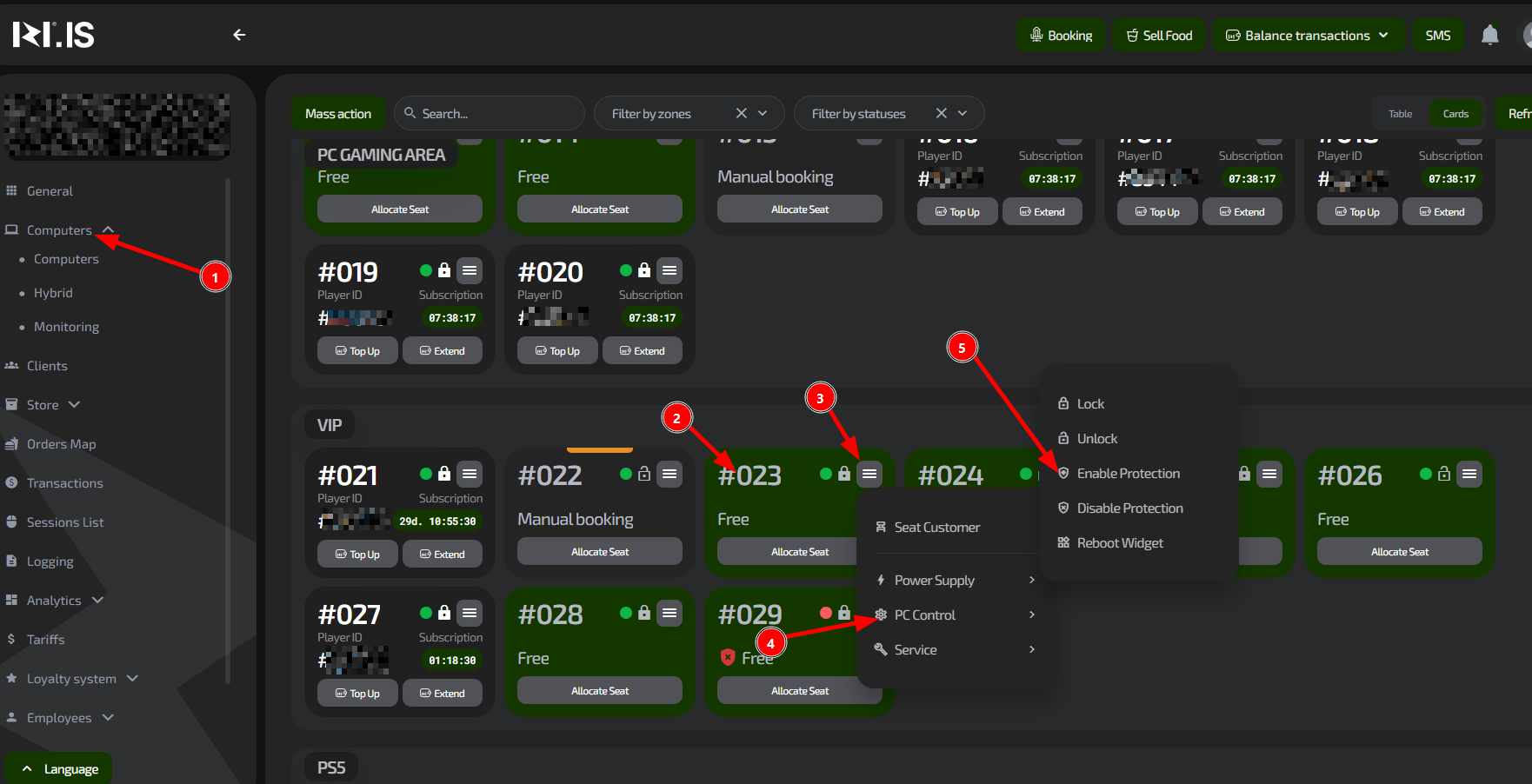 Explain how the protection system for gaming PCs works in IZI CRM, what it is for, and how to correctly enable/disable protection in different situations.