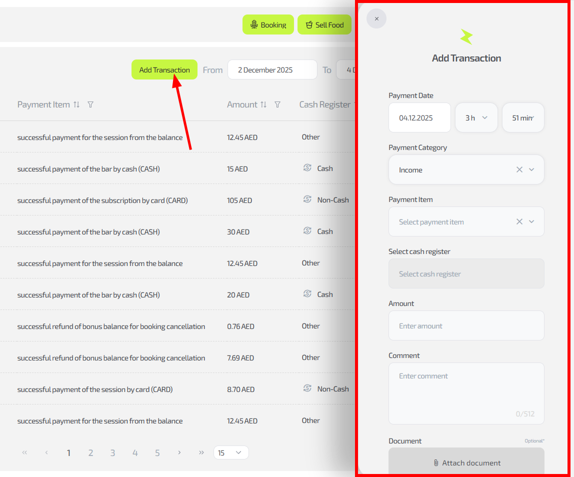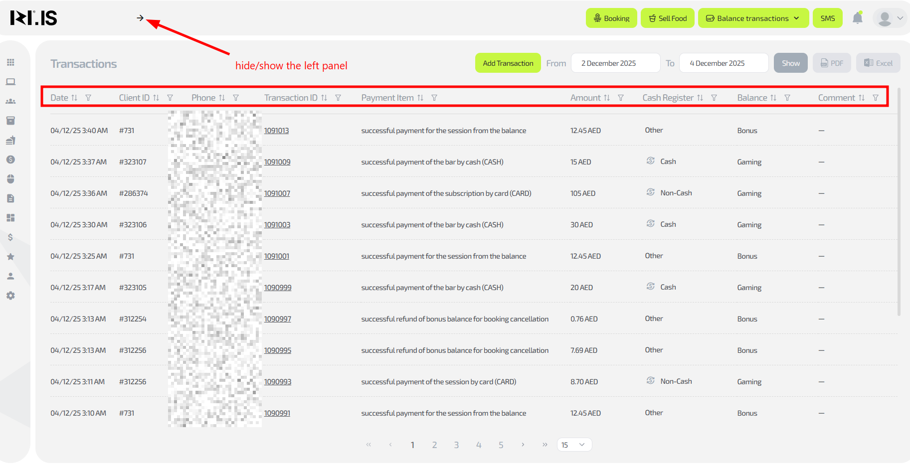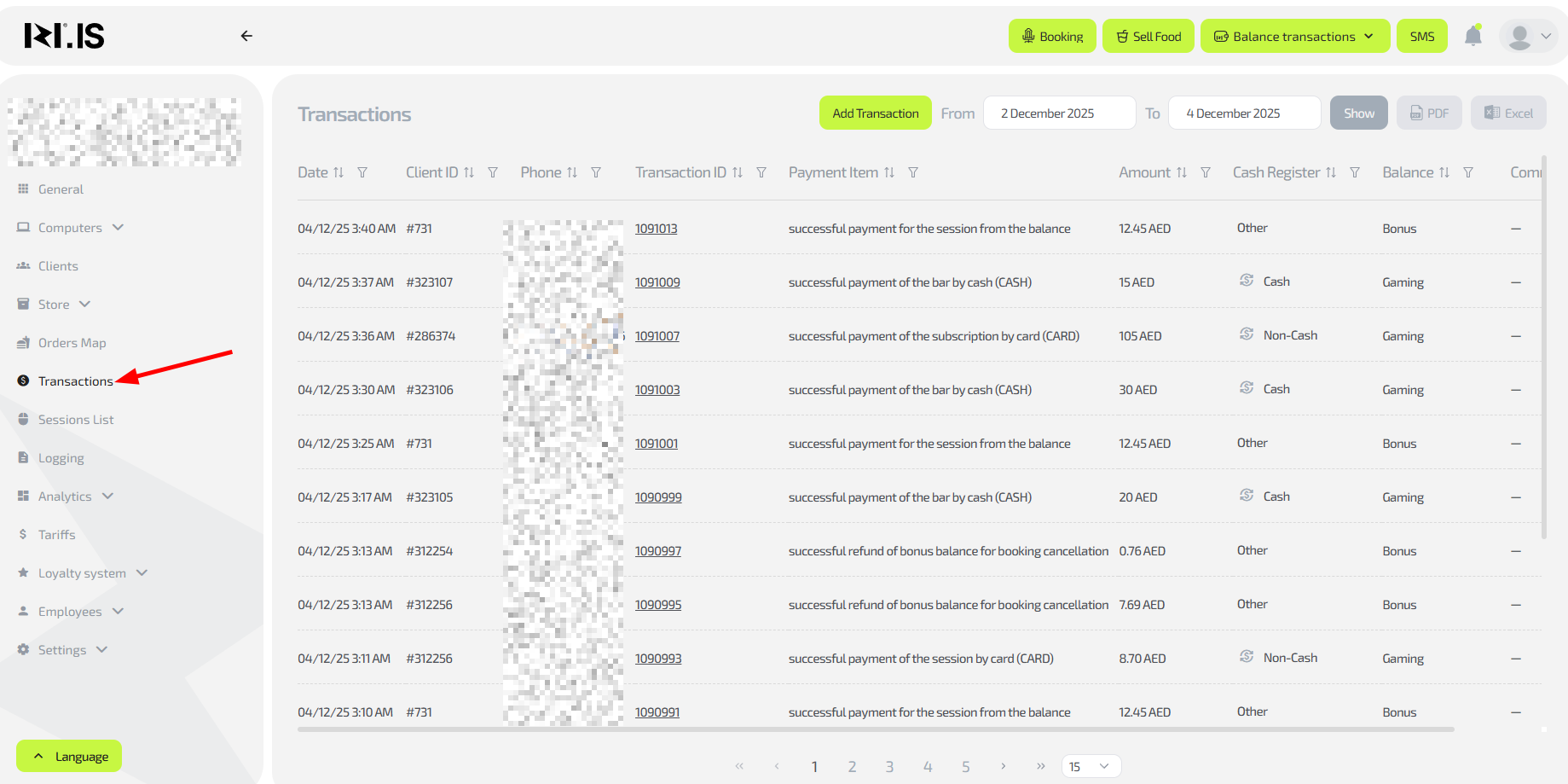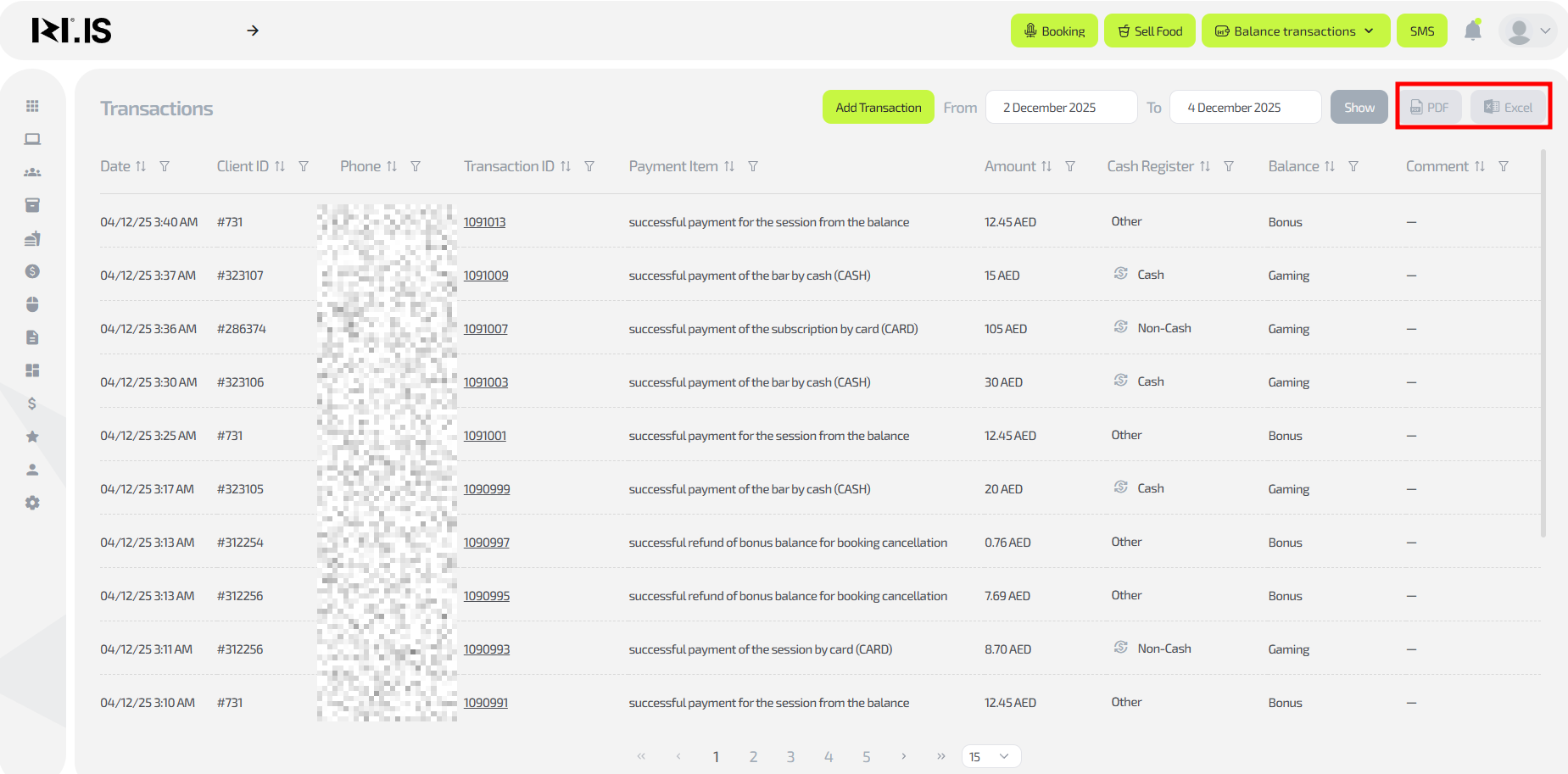 Show how an administrator can work with the “Transactions” section in IZI CRM: view, filter, export, and add records manually.