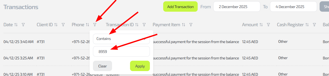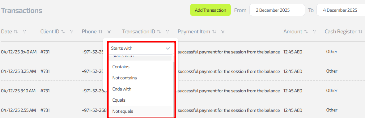 - Payment item – filter by operation type (top-up, purchase, refund).