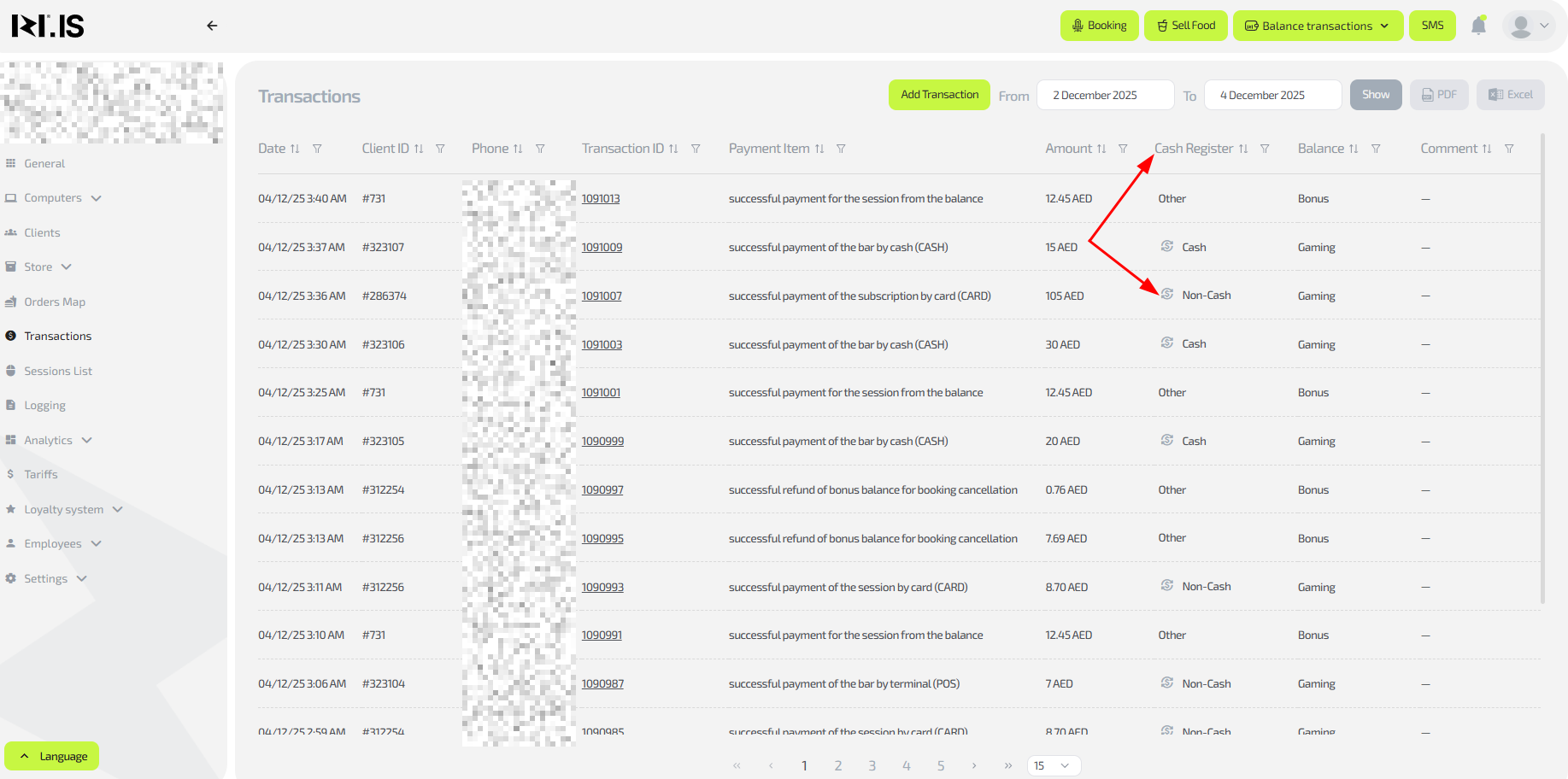 - In the row of the found transaction, click the ↻ icon (dollar sign with circular arrows) in the “Cash register” column