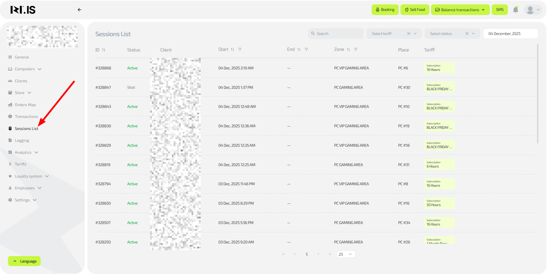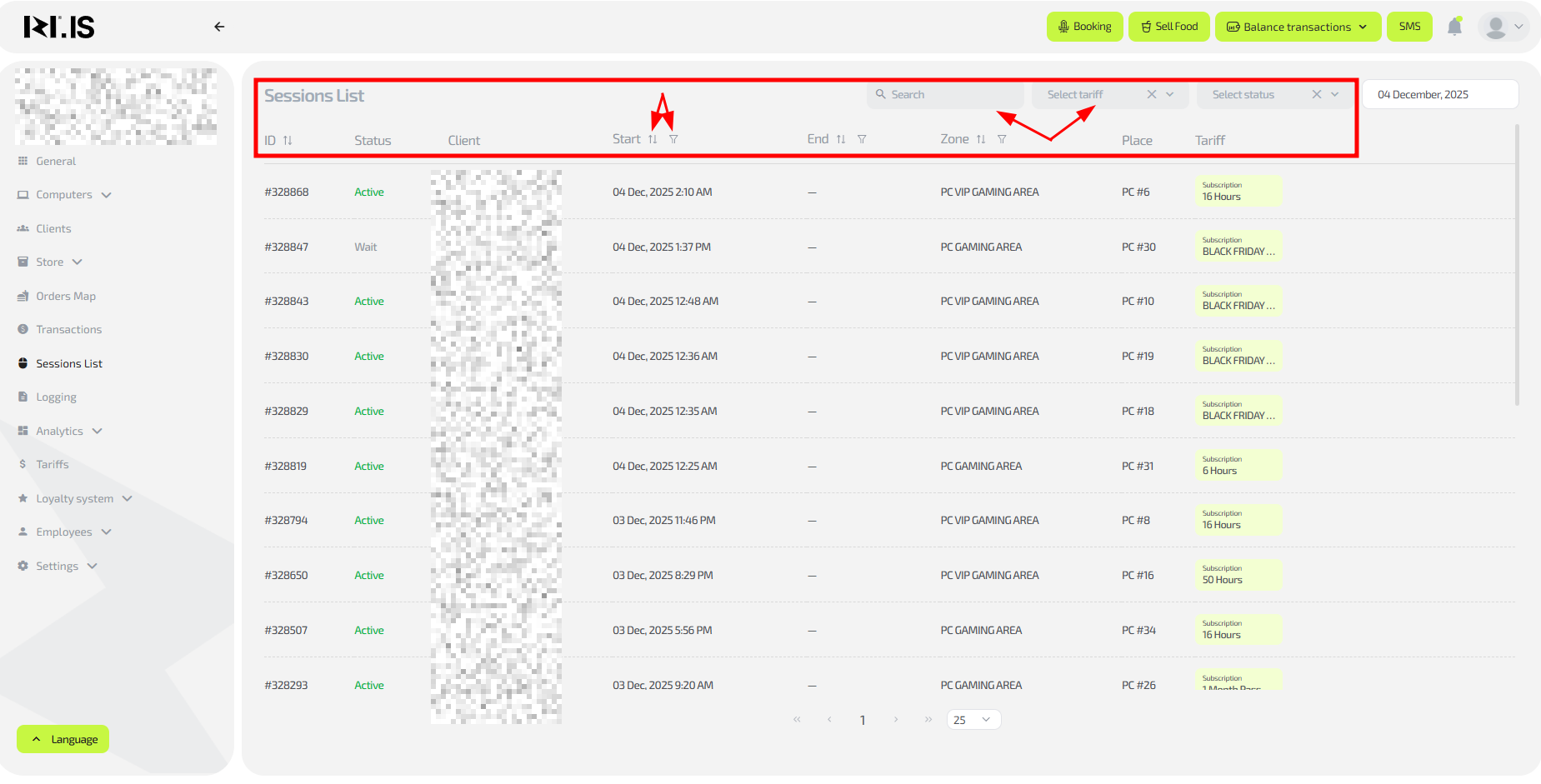 1. Review the session data: session ID, status, client phone (or “one-time”), start and end date/time, zone, PC number, tariff(s).