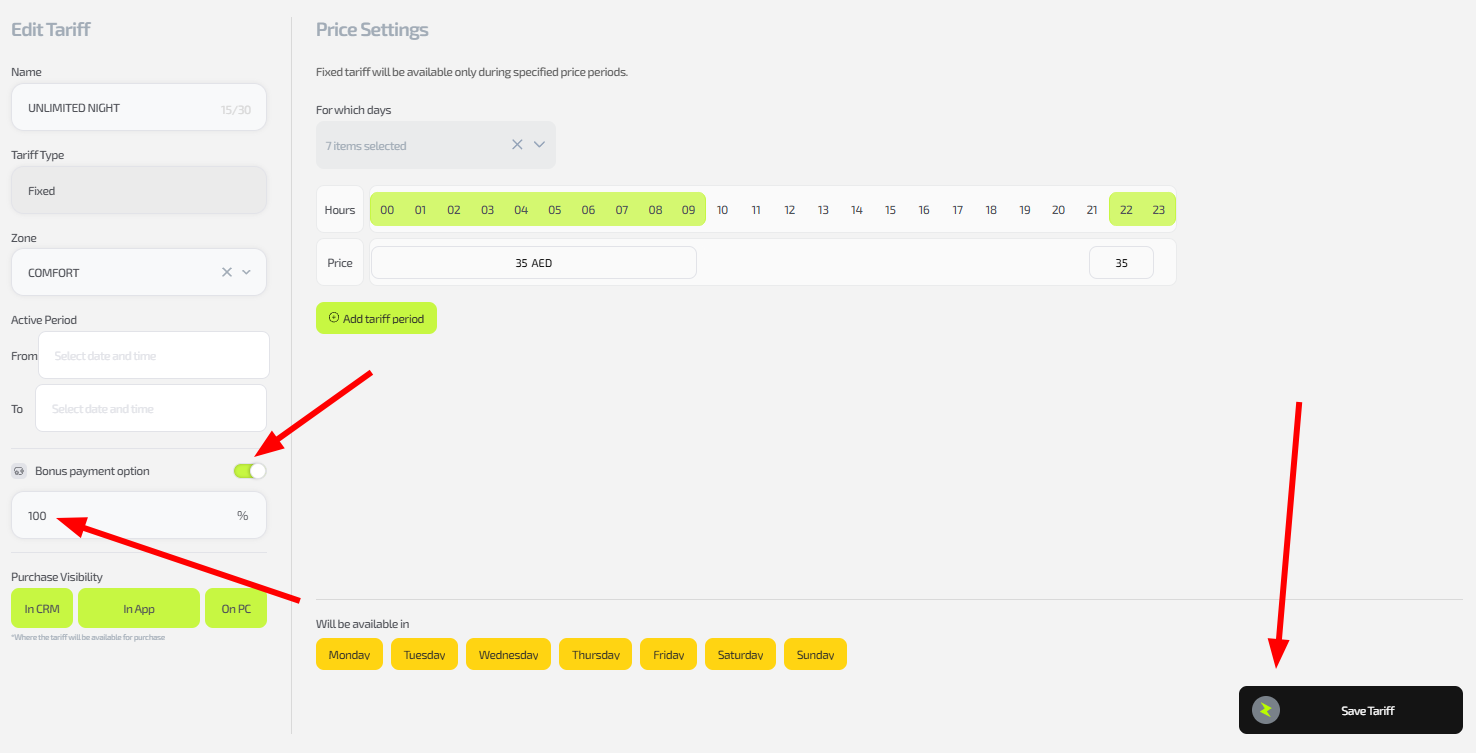 Important: If the switch is inactive, payment with bonuses is completely forbidden. The setting is applied only to the selected tariff.