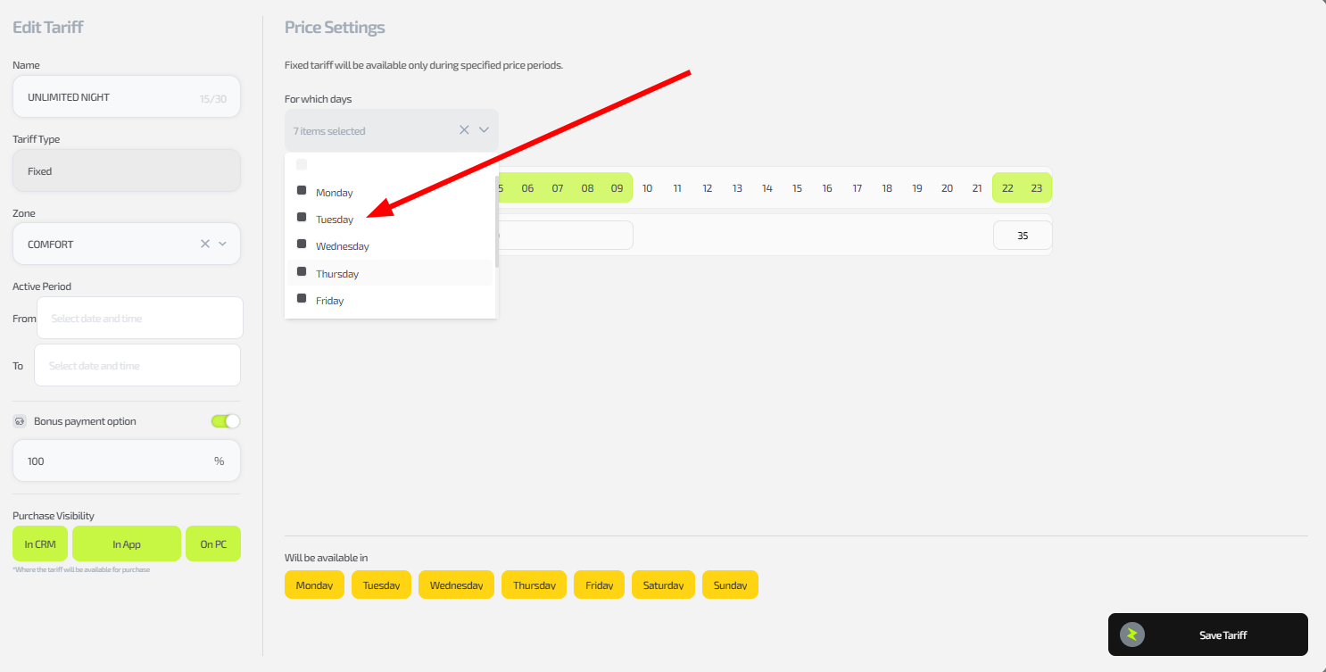 - How to select and configure days of the week for a tariff