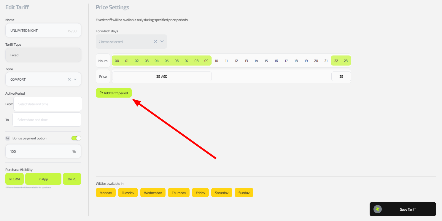 Important: Each day of the week can be selected only in one period — duplicates are not allowed. If you configure several tariffs, repeat this process for each one separately.