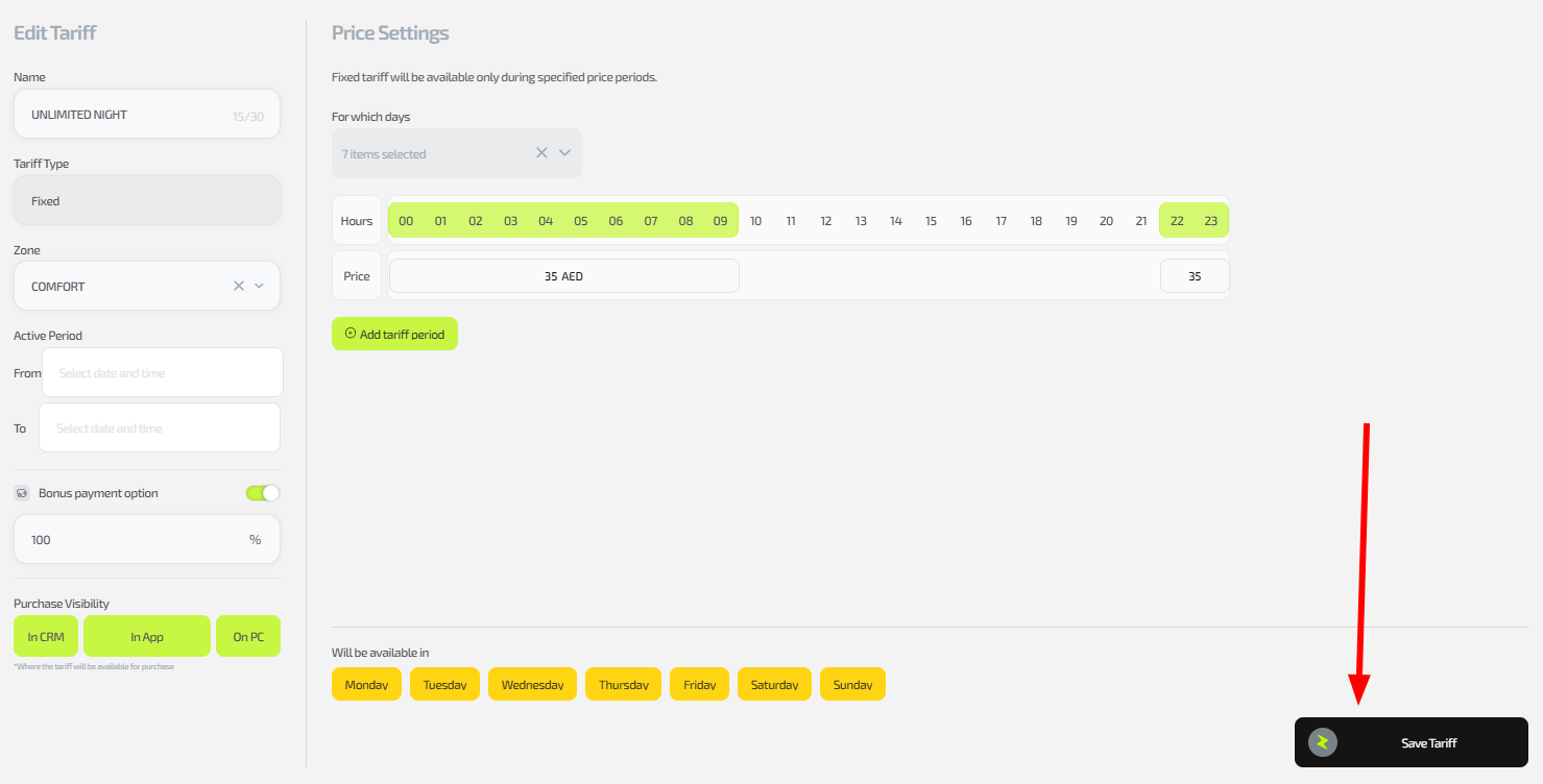 - After setting all periods click “Save tariff”.