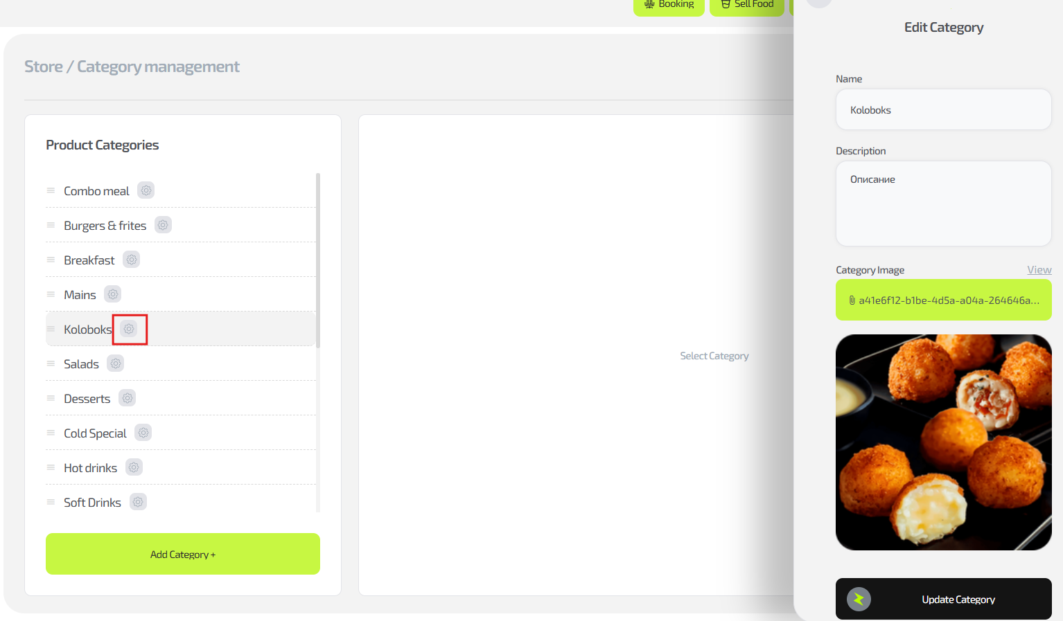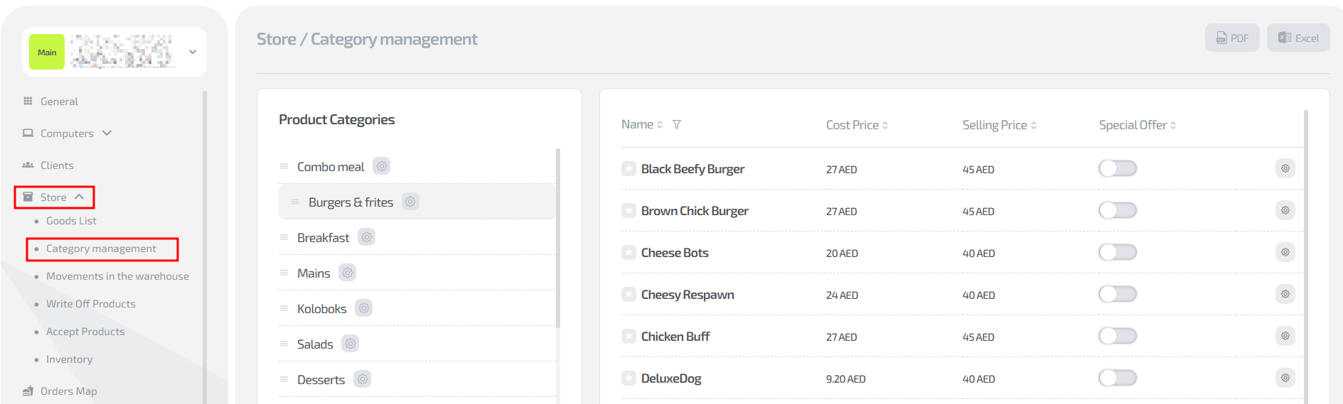 Show how to work with the “Category management” section: create and edit product categories, add and edit bar items, manage write-offs and receipts, change categories and the catalog structure.