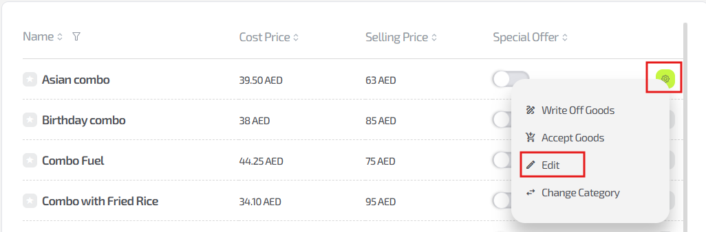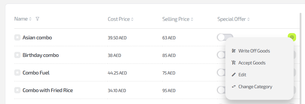 Select a category and then the required item, then click the gear icon on the right side of the row.