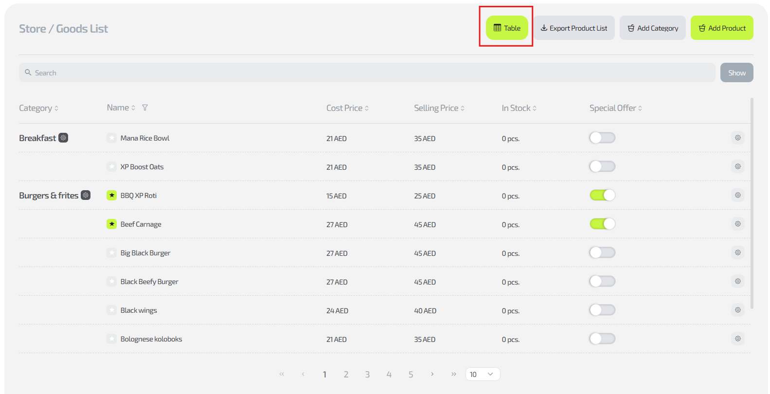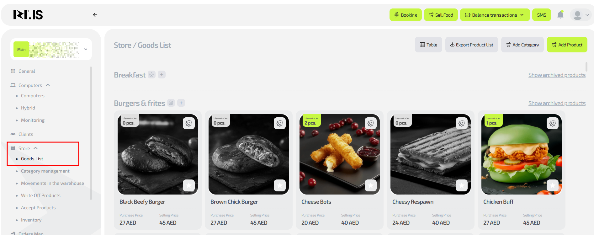 After going to Store → Items list, a visual catalog of items grouped by categories opens.