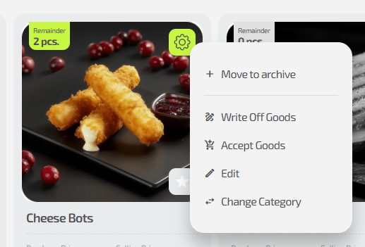 (Details of these operations are covered in separate articles: write-off, receipt, item editing and working with categories.)
