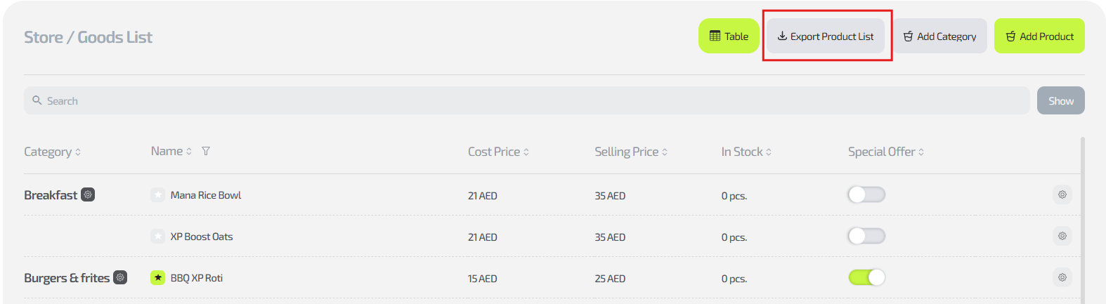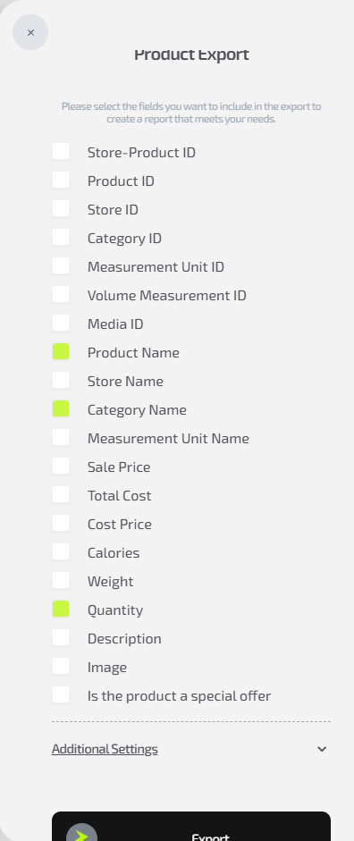 After selecting parameters, click “Export” — an Excel file will be downloaded.