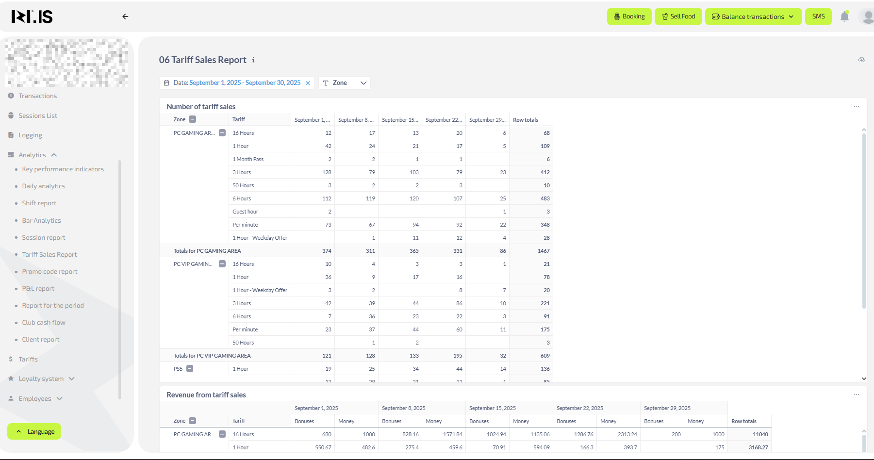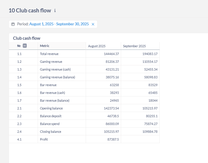 • Revenue composition — see which sources bring more (balance top-ups, bar, tariffs). If bar revenue is falling, you may be missing popular items