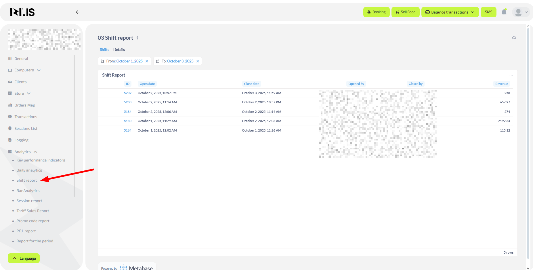 • Shift details — click the shift ID to see all operations; this helps find discrepancies or staff issues