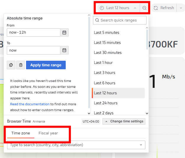 - Time interval — last 1 hour, 12 hours, day, week or a custom range;