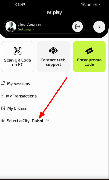 - In the profile menu find the “Choose city” section