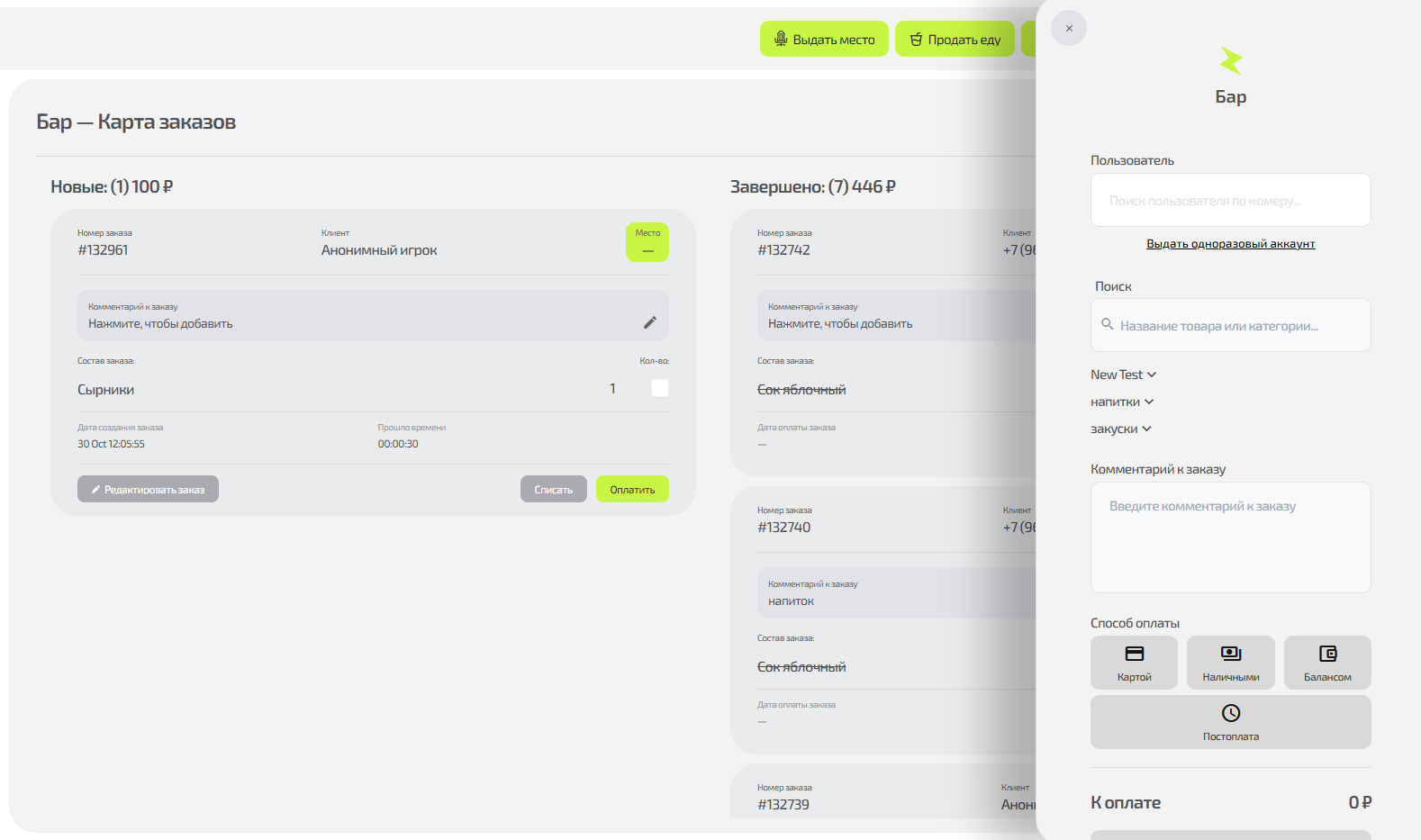 - Быстрые операции – Продажа еды, выдача места, операции с балансами клиентов, получение кода из СМС для регистрации нового клиента