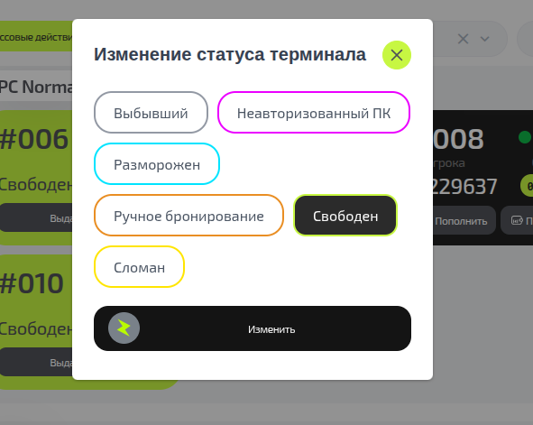 | Свободен | ПК исправен, готов к работе, можно сажать клиентов | Видит в приложении, может забронировать |