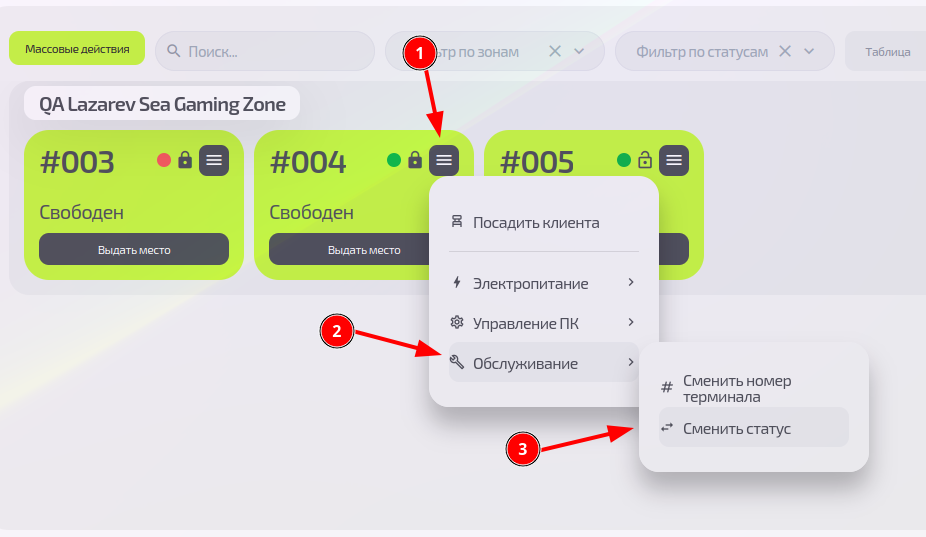 - Как статус влияет на бронирование — только «Свободные» ПК видны клиентам в приложении.