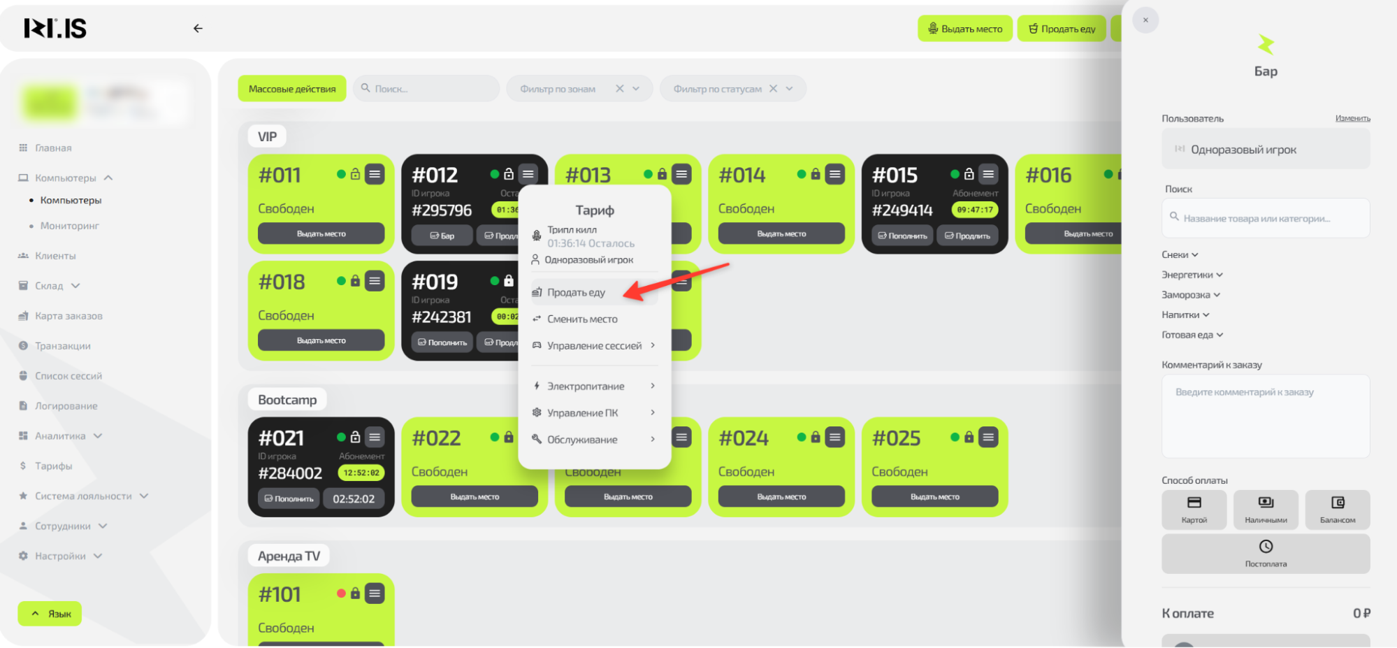 Позволяет добавить товары из бара и списать оплату с баланса клиента или принять оплату через кассу.