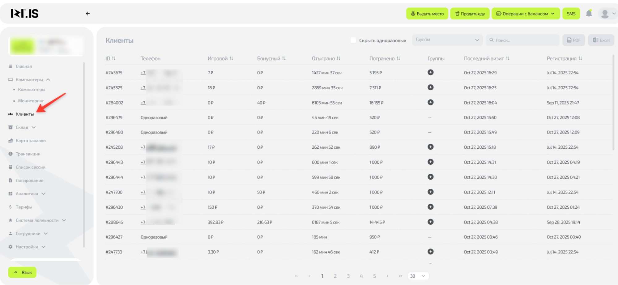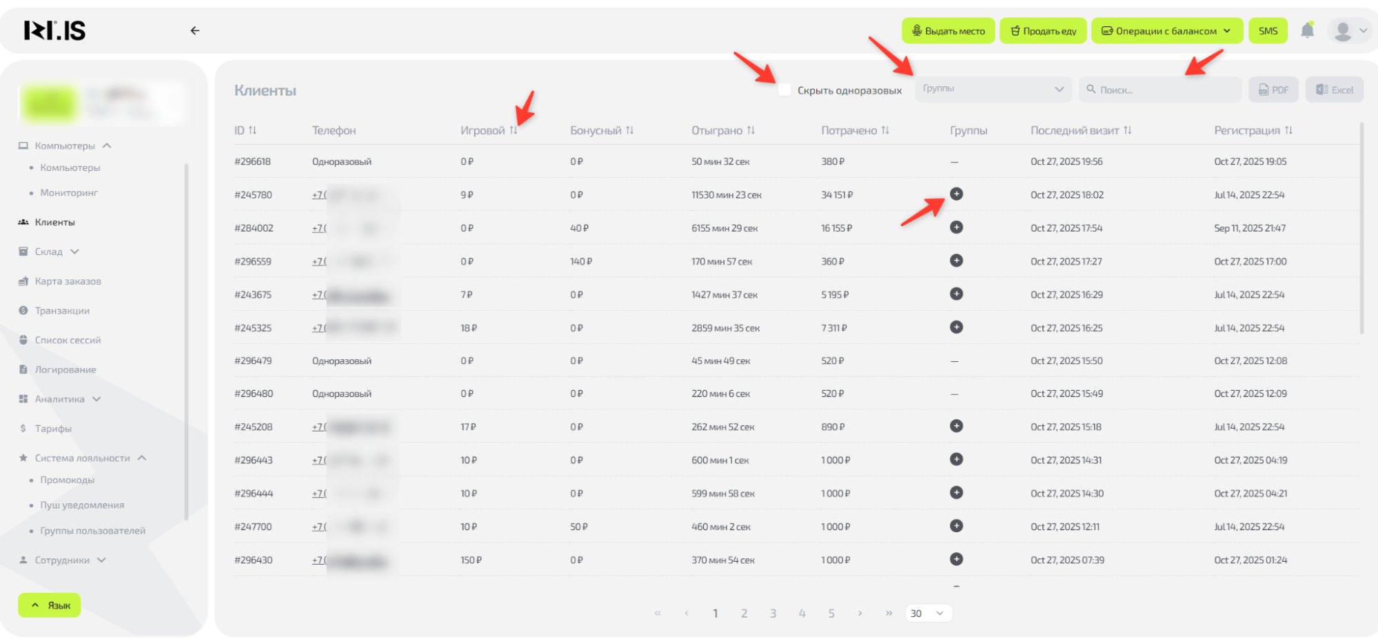 Показать, как администратор клуба может просматривать, фильтровать и редактировать информацию о клиентах в разделе “Клиенты”: от анализа списка посетителей до ручного изменения баланса и назначения групп.