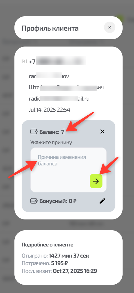 Важно: Изменения баланса фиксируются для аудита — всегда указывайте обоснование.