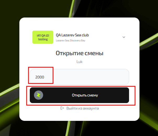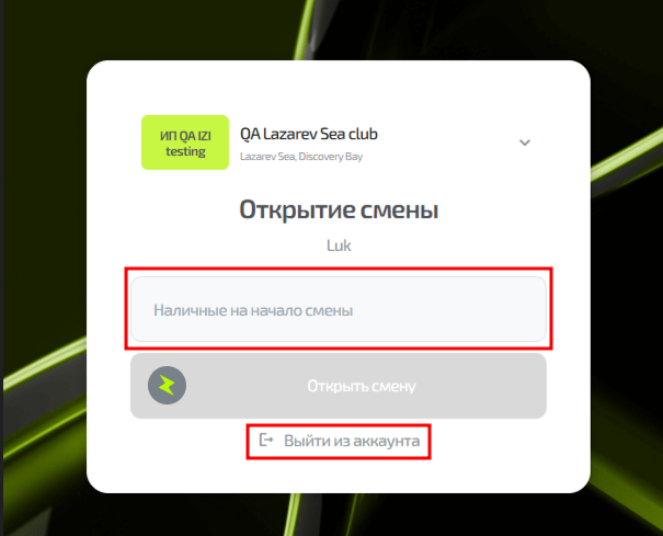 Перед открытием смены доступна кнопка «Выйти из аккаунта»