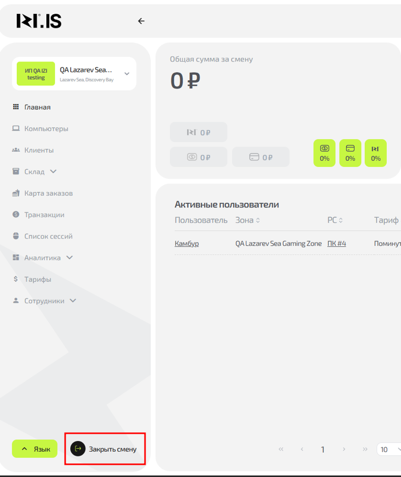 Если комментарий не указан, кнопка «Закрыть смену» неактивна.