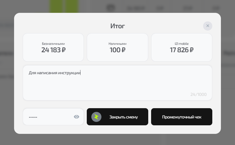 Отображается общая сумма выручки за смену разбитая по способам оплаты: наличные, безналичные и мобильное приложение IZI.Play 3. Обязательный комментарий