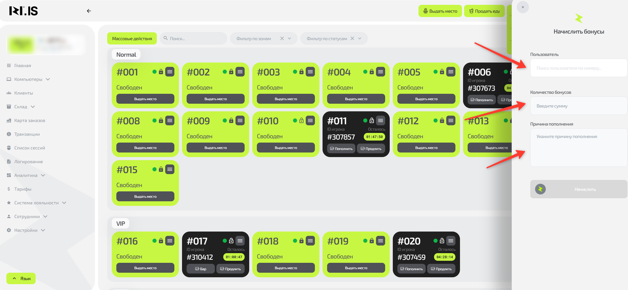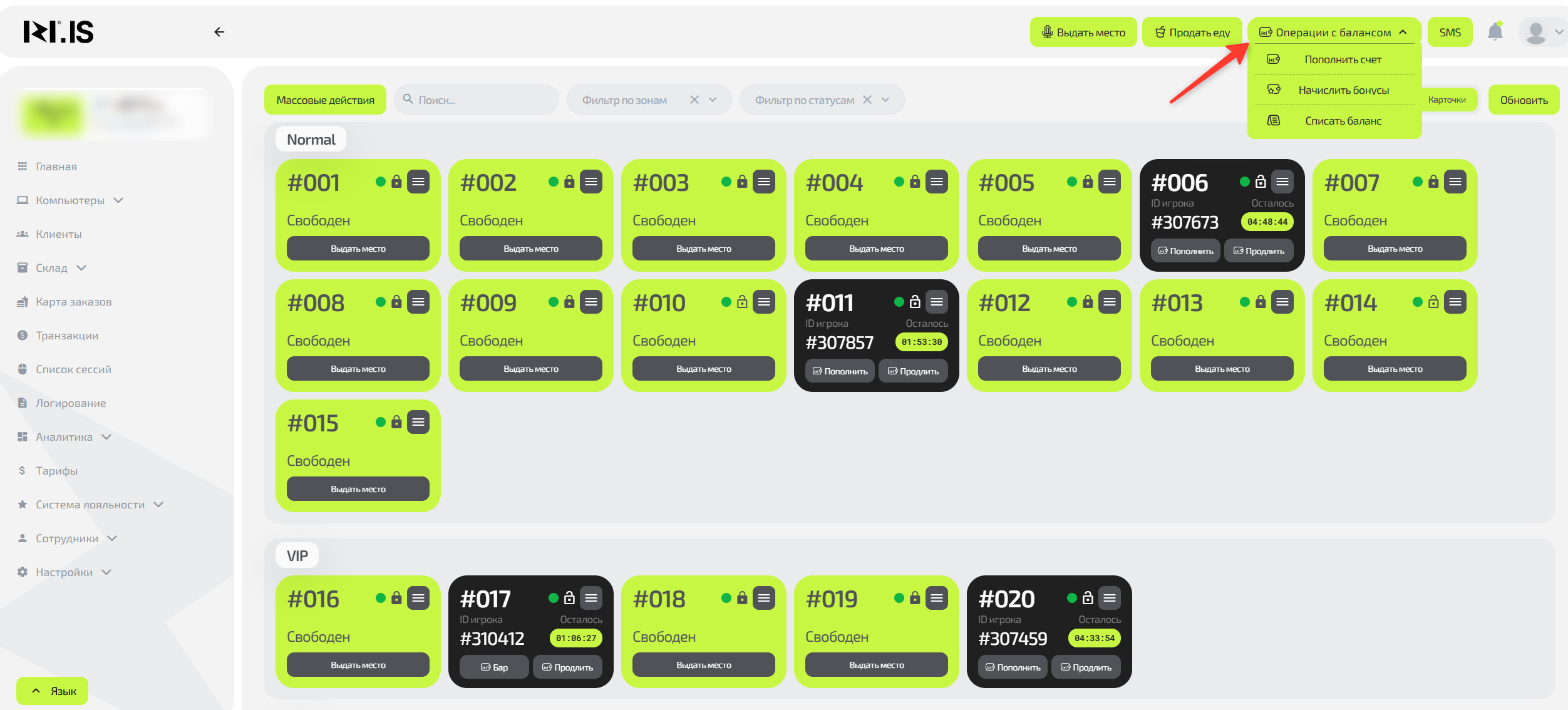 Показать, как администратор может управлять счетами клиента: пополнять баланс для оплаты игрового времени или товаров, начислять бонусы по акции и корректно списывать средства.