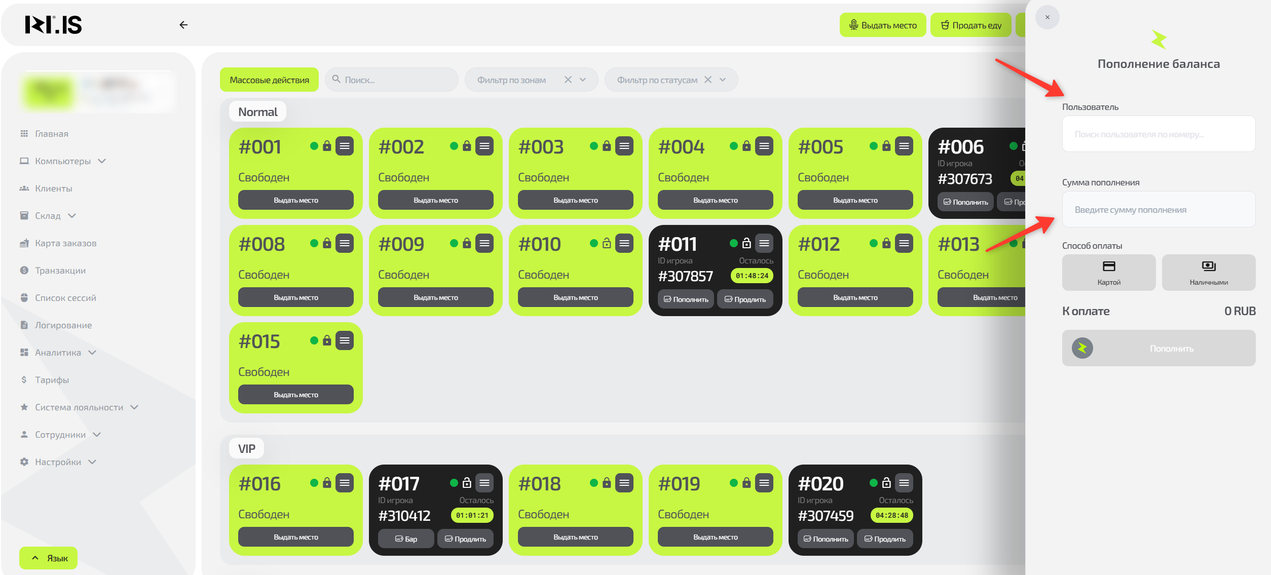 Клиент хочет оплатить сессию картой.Пополните баланс, выбрав способ «Карта». Для точного учета безналичной выручки в отчётах.