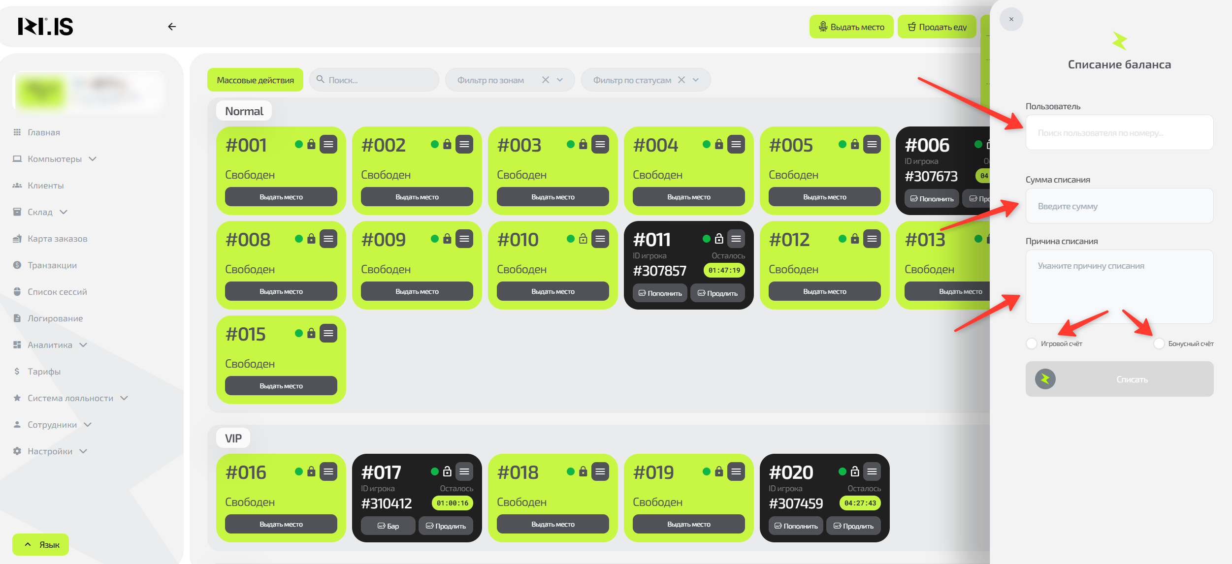При списании система спрашивает «Тип счета».- Игровой счет — реальные деньги клиента. - Бонусный счет — баллы за акции. Почему это важно? Правильный выбор предотвращает ошибочное списание реальных денег вместо бонусов.