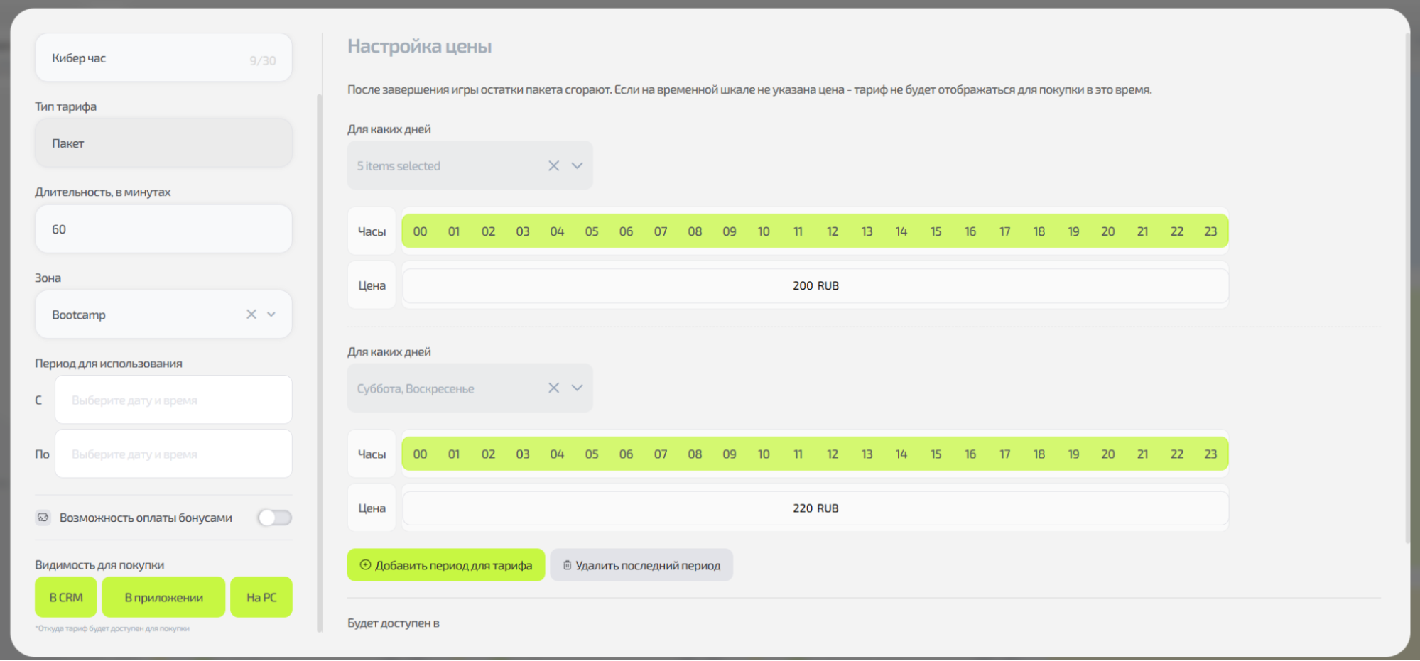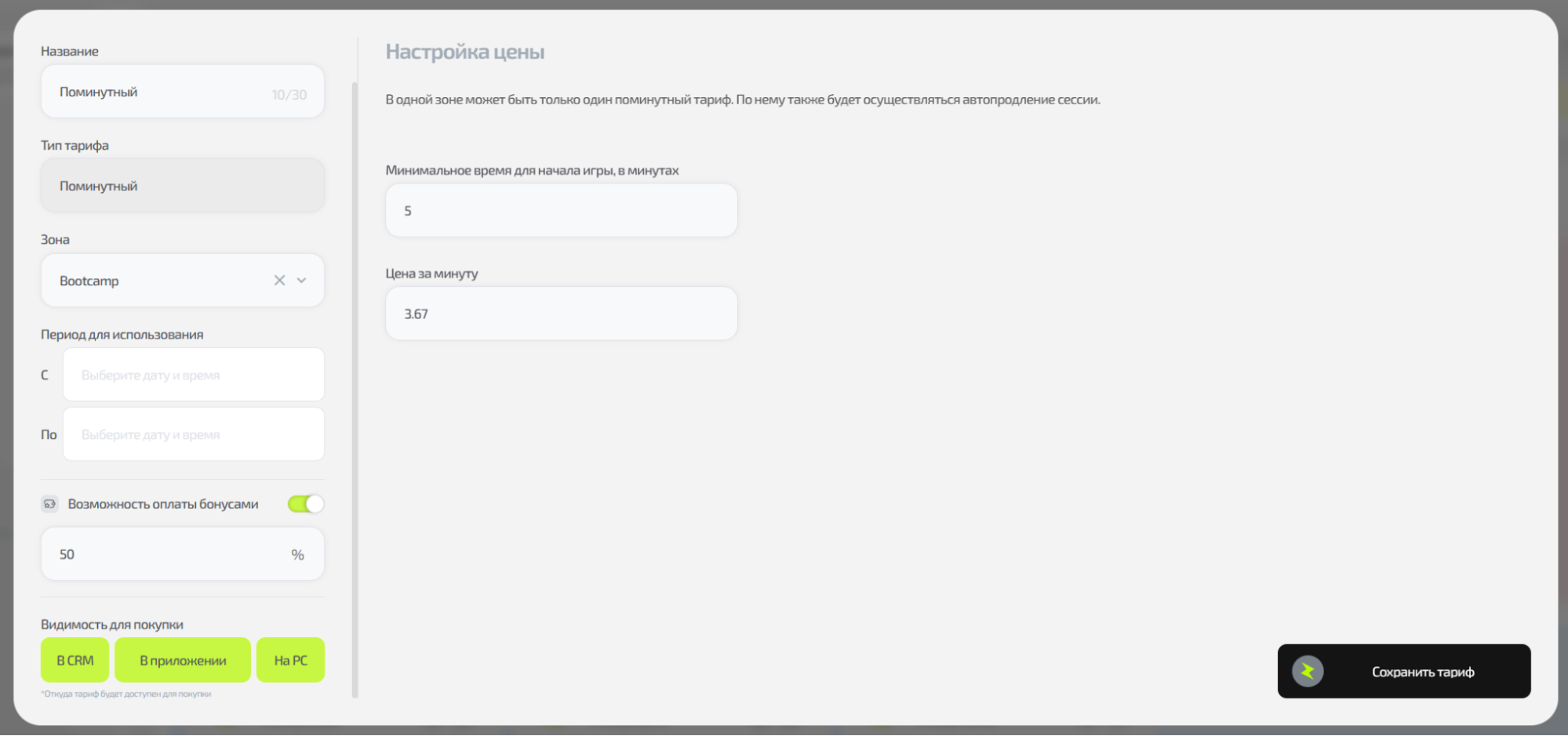 - Указывается цена за час, на её основе автоматически рассчитывается стоимость минуты