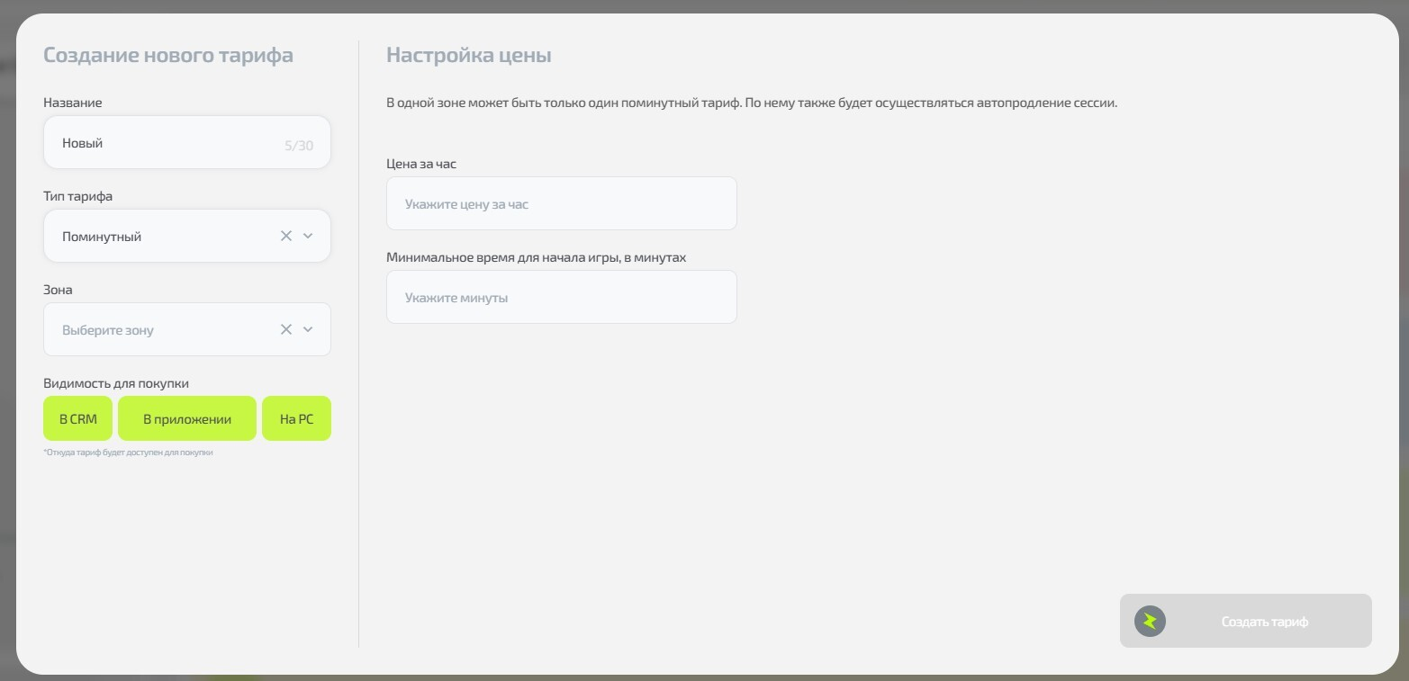 - видимость тарифа (где тариф будет доступен для покупки - CRM, приложение, ПК).