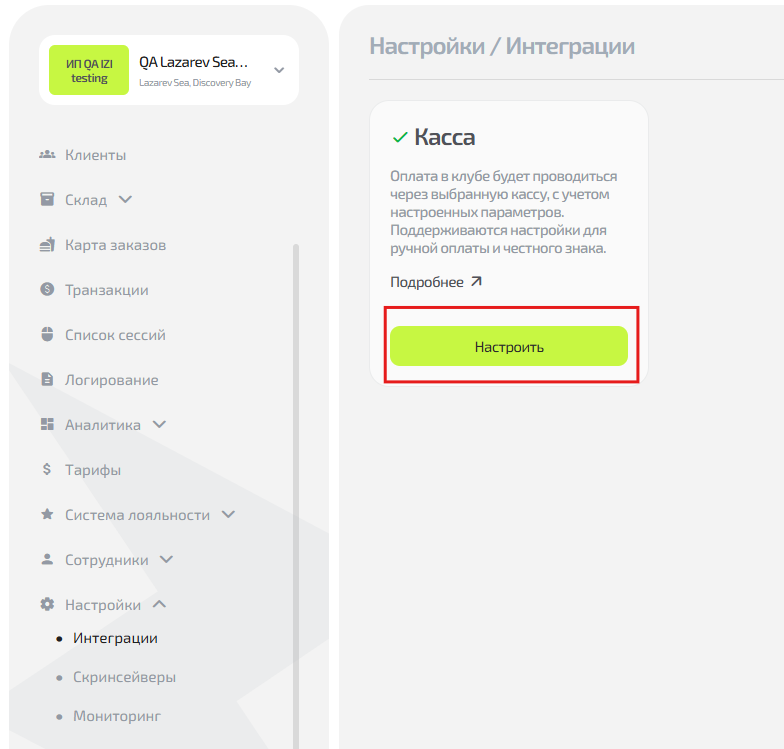 Показать, как подключить и настроить кассу и платёжный терминал в CRM IZI, объяснить сценарии работы кассовой интеграции, а также описать назначение кассы и её роль в финансовых операциях клуба.