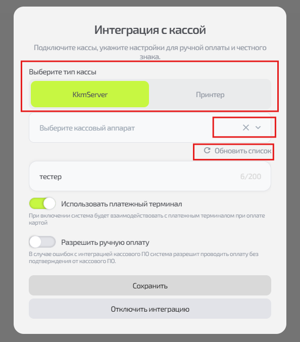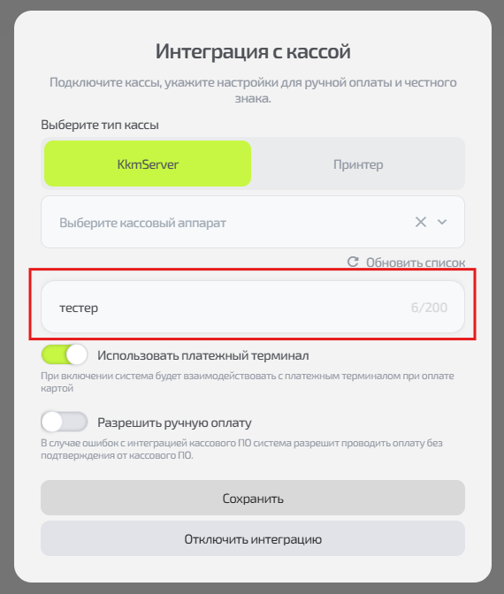 - «Отключить интеграцию» — полностью отключает взаимодействие CRM с кассой.