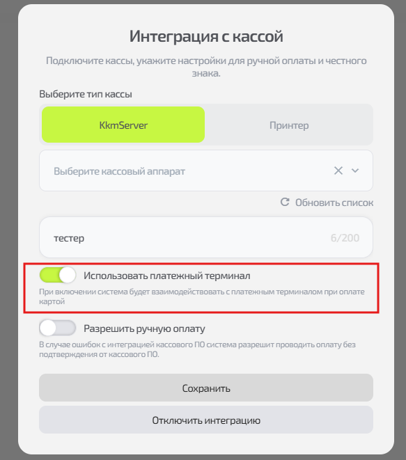 - Если терминал подключён к ПК администратора — включите «Использовать платёжный терминал».