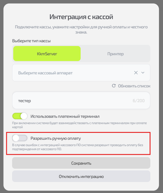 - Если касса временно не отвечает — включите «Разрешить ручную оплату».