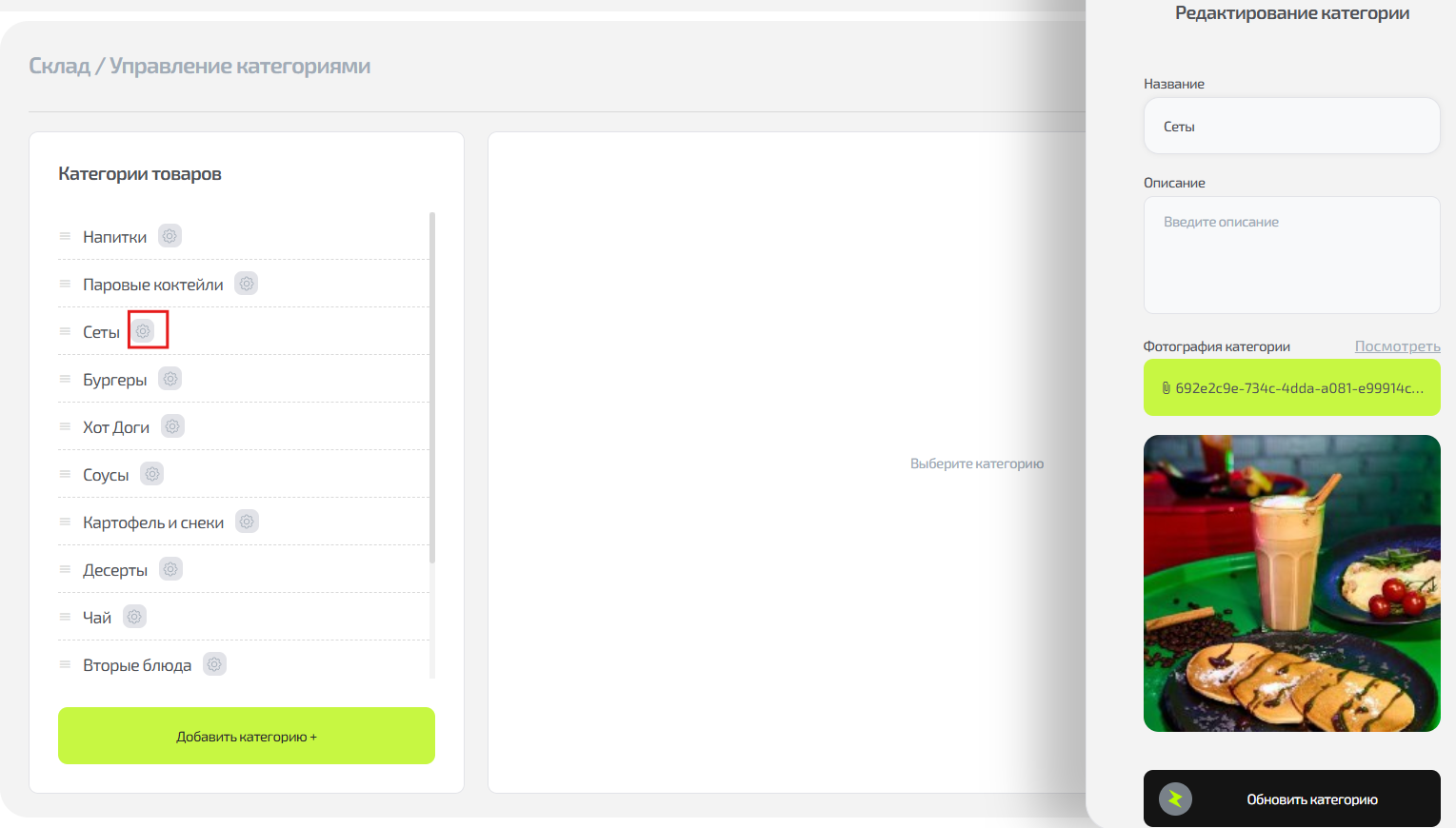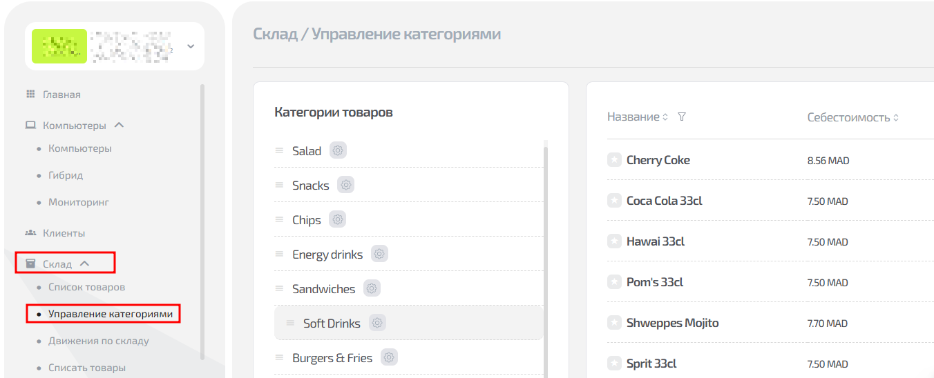 Раздел Склад → Управление категориями состоит из двух основных областей: