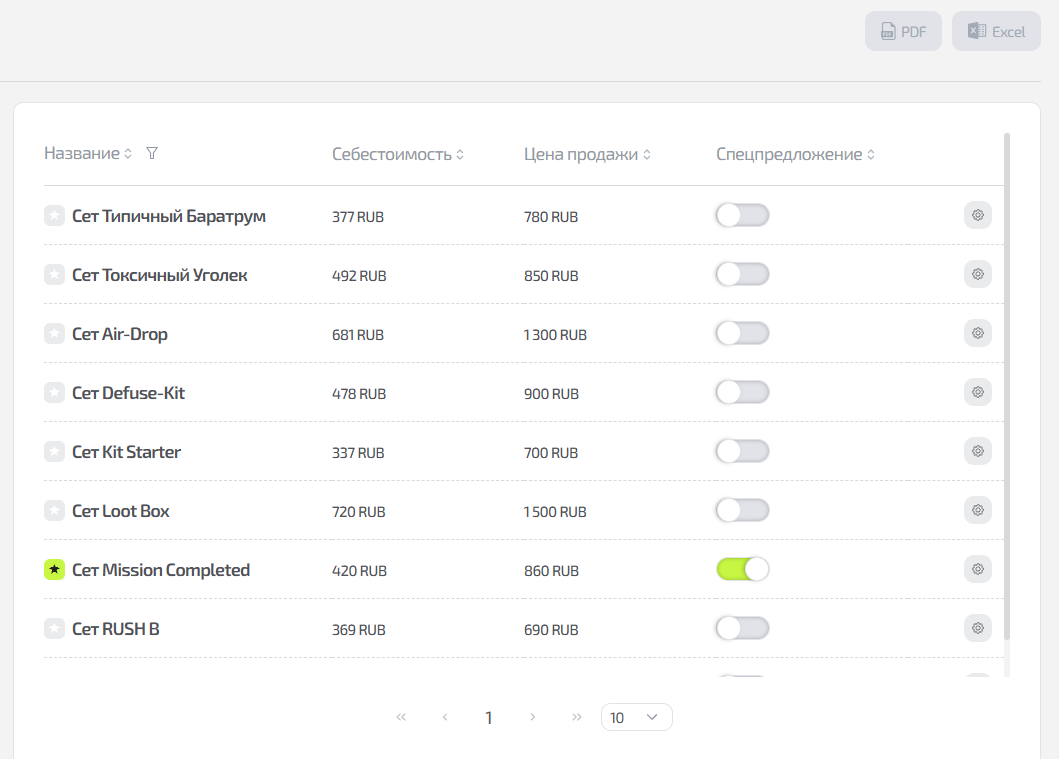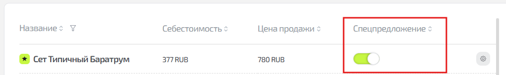 При включении товар помечается как акционный и может выделяться в интерфейсе бара.
