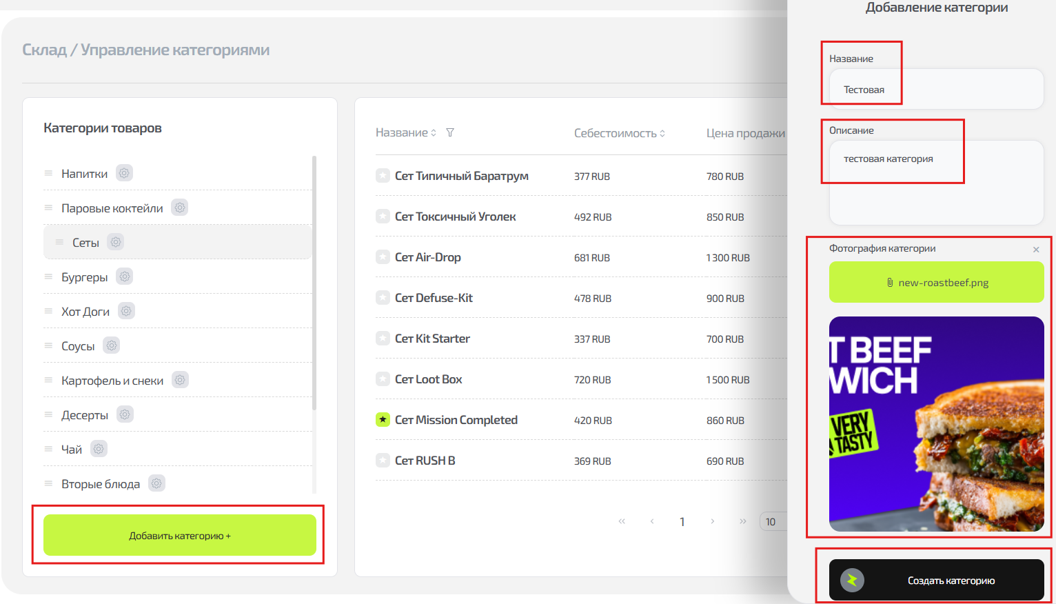 Показать, как работать с разделом «Управление категориями»: создавать и изменять категории товаров, добавлять и редактировать товары бара, управлять списанием и приёмом товара, менять категории и структуру каталога.
