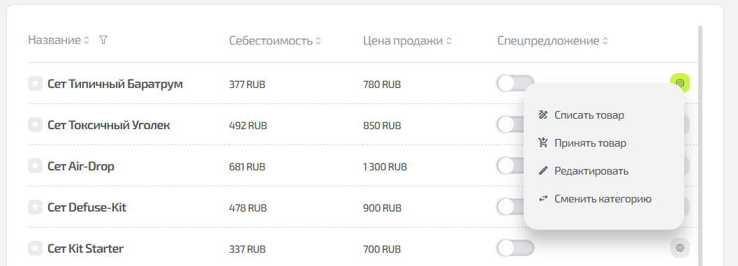 — уменьшение остатка товара вручную (например, при порче или тестировании). - Принять товар
