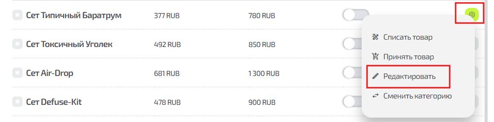 Выберите категорию и далее нужный товар, нажмите на изображение шестирёнки справа в каждой строке списка.