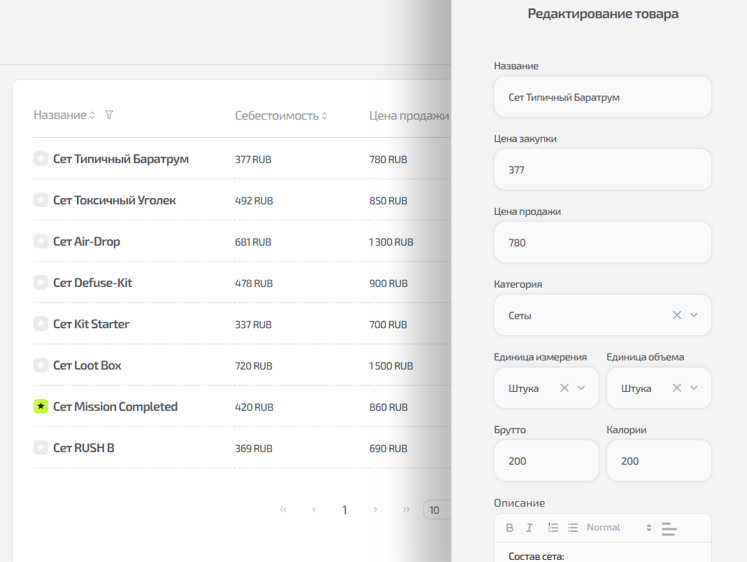 | Товар не сохраняется | Проверьте, заполнены ли поля брутто и калорийность |