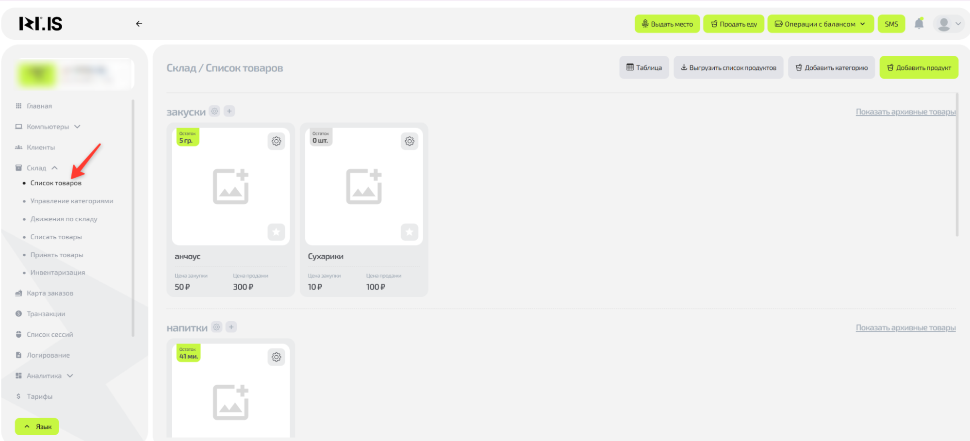 2. Перейдите в раздел "Склад" → "Список товаров".