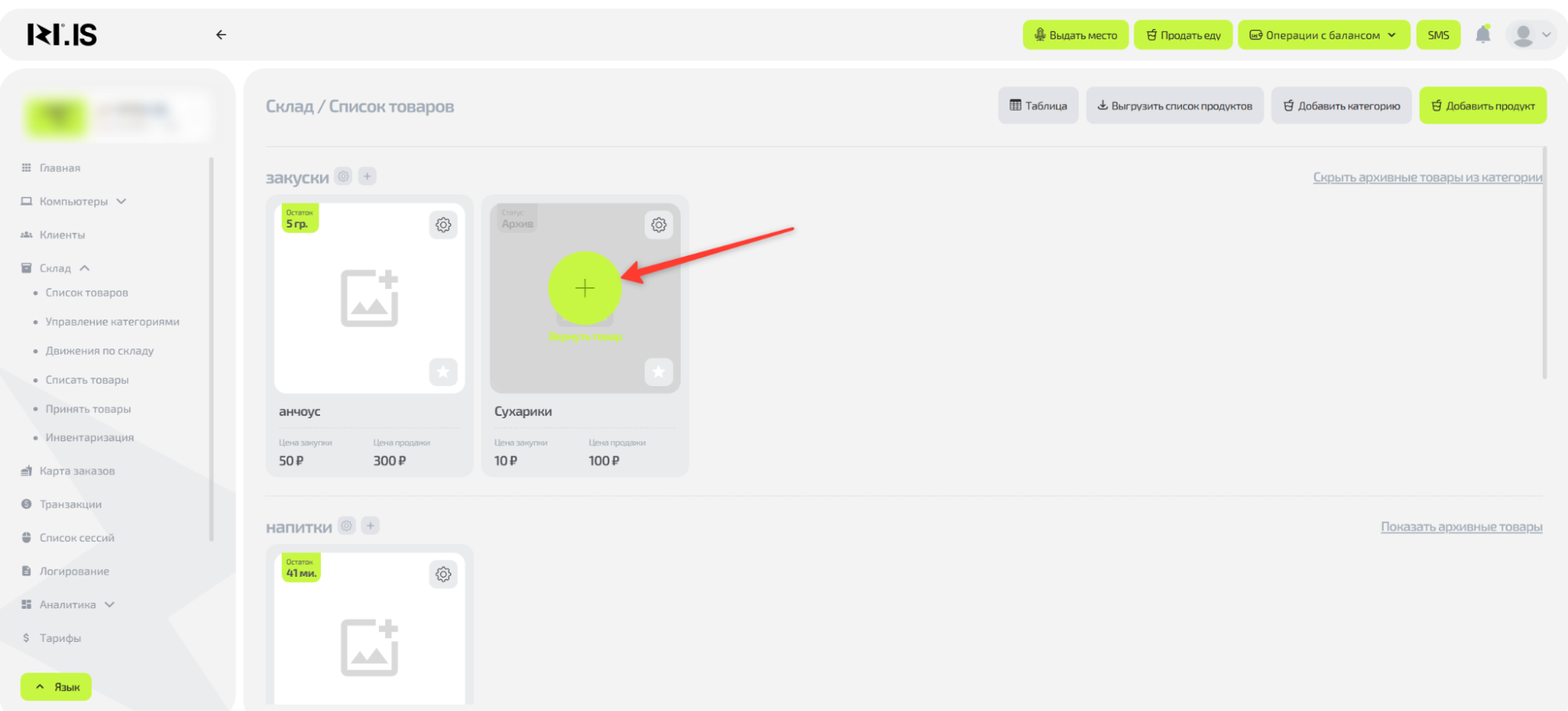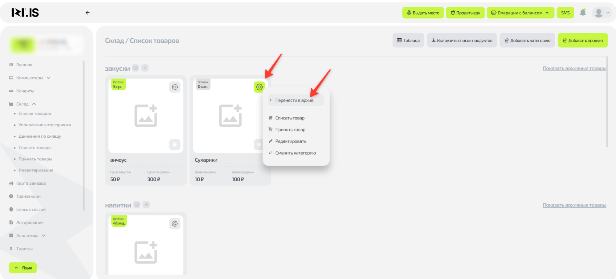 Показать, как сотрудник клуба может скрывать устаревшие товары, перемещая их в архив, просматривать архивные товары по категориям и возвращать их в активный список.