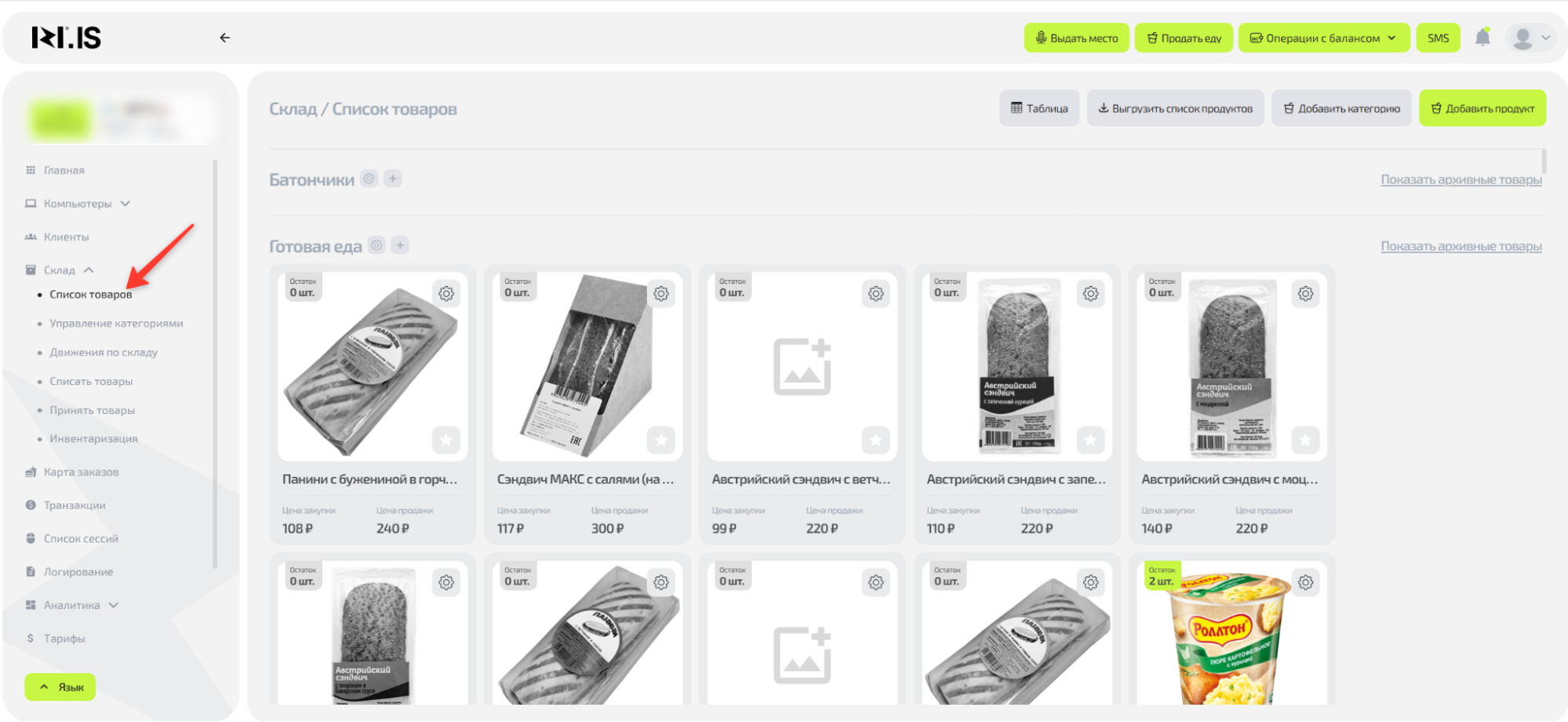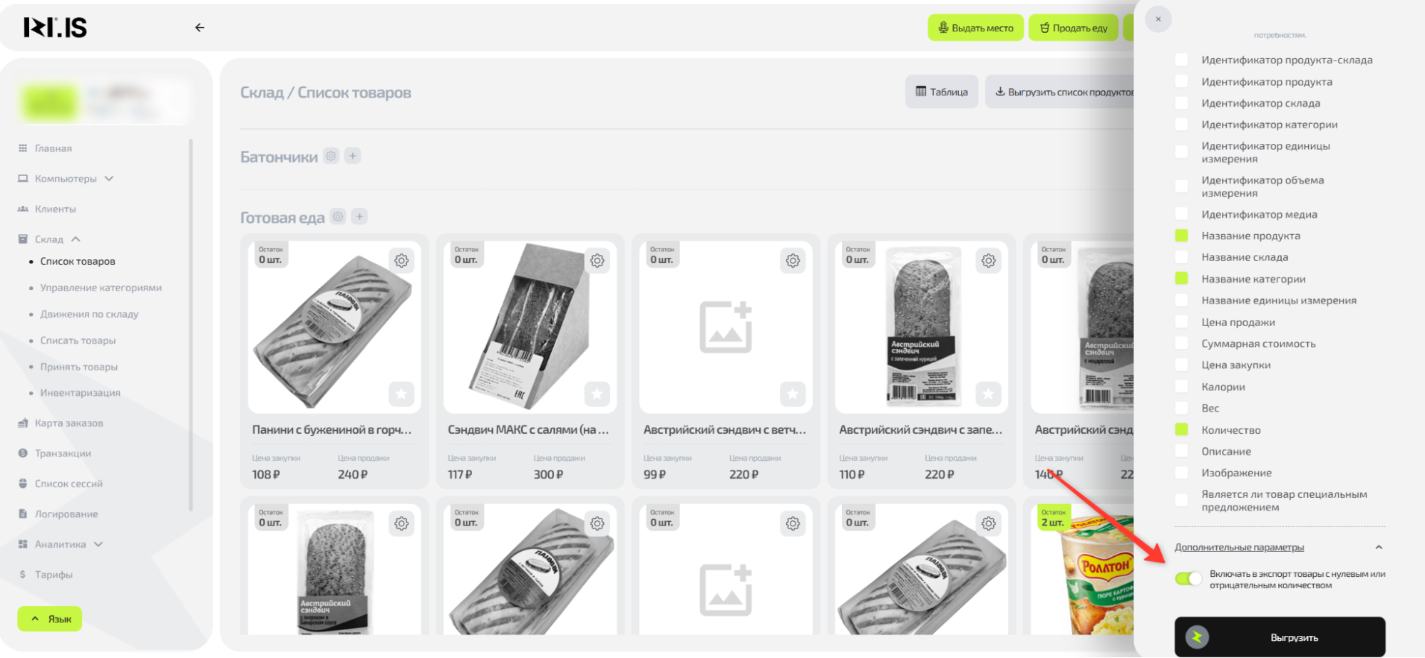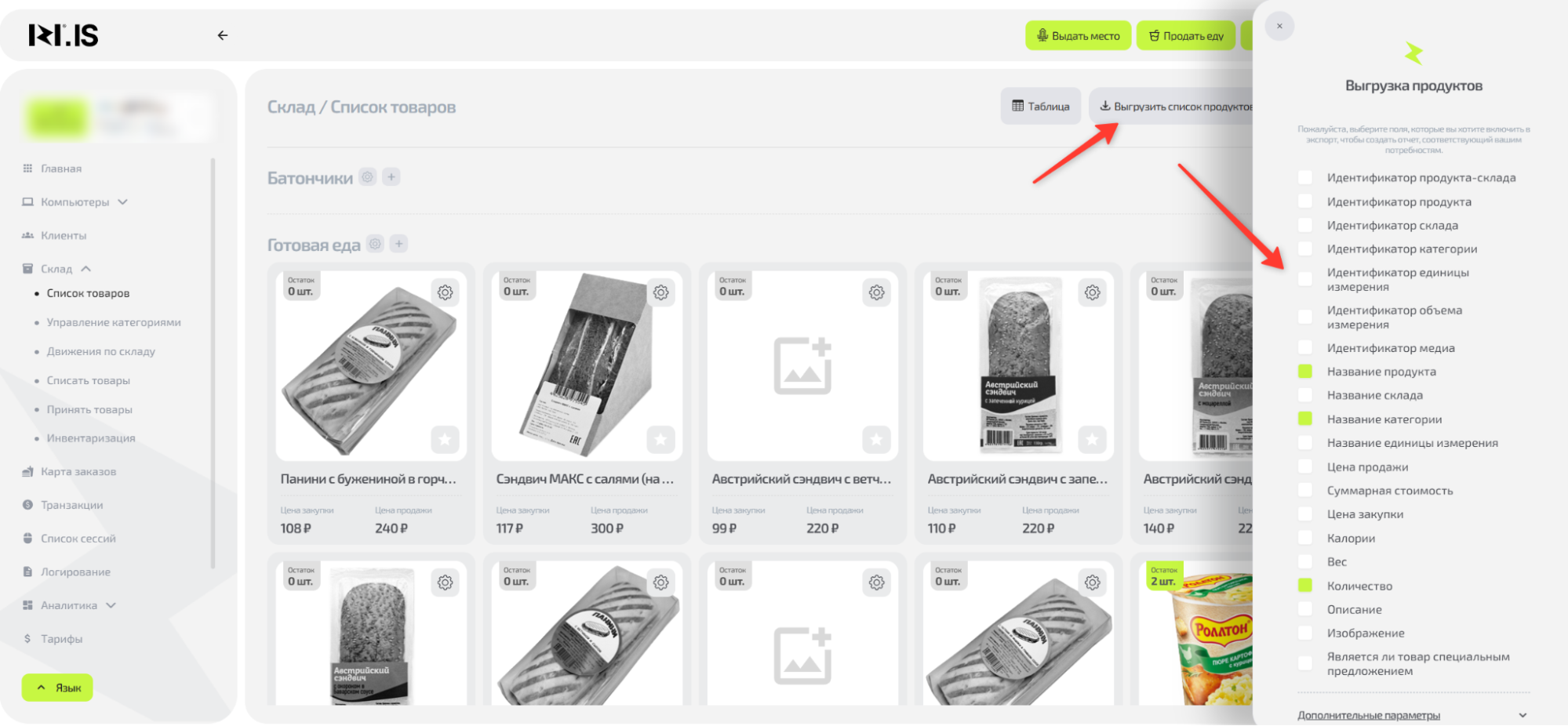 - Справа нажмите кнопку "Выгрузить список продуктов".