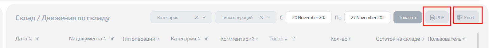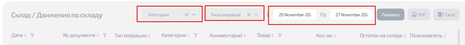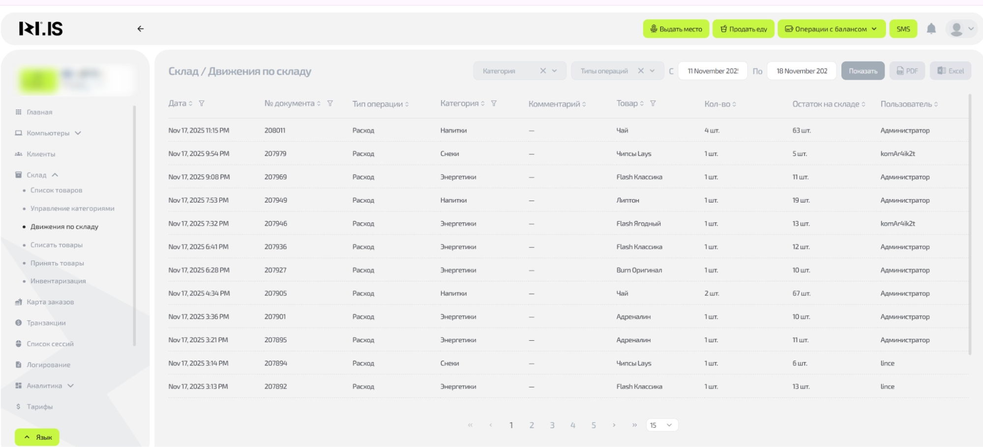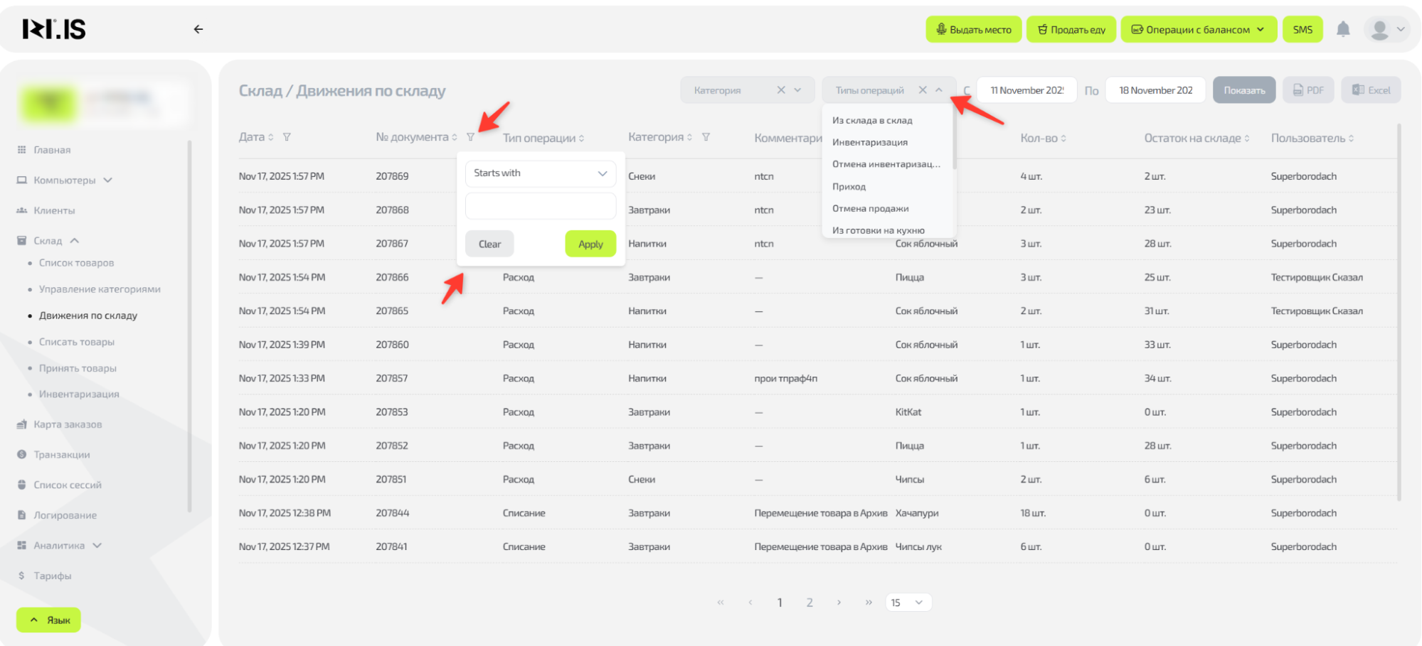 Показать, как сотрудник клуба может работать со страницей «Движения по складу»: находить нужные операции, анализировать остатки, фильтровать данные и экспортировать отчёты.
