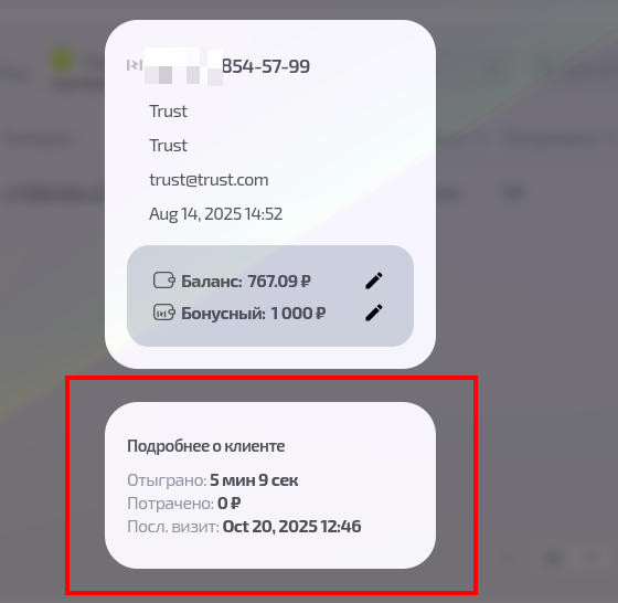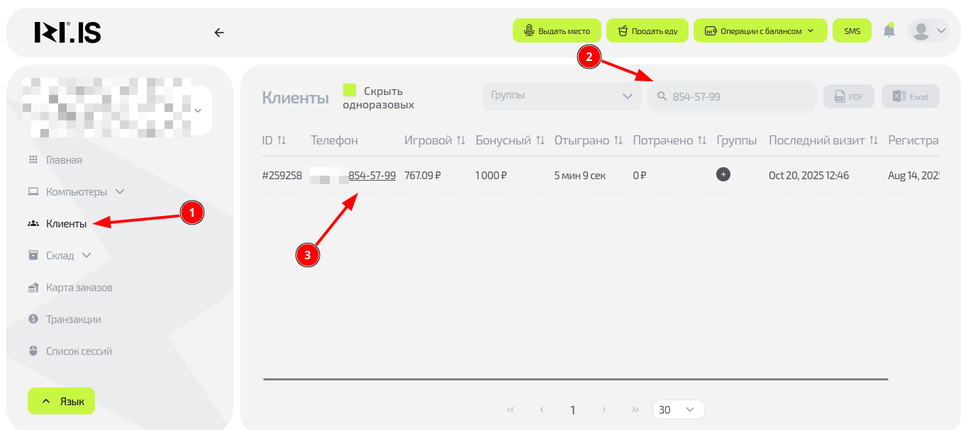 Зачем это нужно: Чтобы быстро получить доступ к карточке клиента для пополнения баланса, проверки статистики или решения спорных ситуаций. Например, когда клиент говорит "Я пополнил, но деньги не пришли", вы можете мгновенно проверить его баланс.