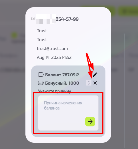 Зачем это нужно: Чтобы исправить технические ошибки или начислить бонусы. Например, если платежная система не сработала, вы можете вручную зачислить сумму, которую клиент уже оплатил.